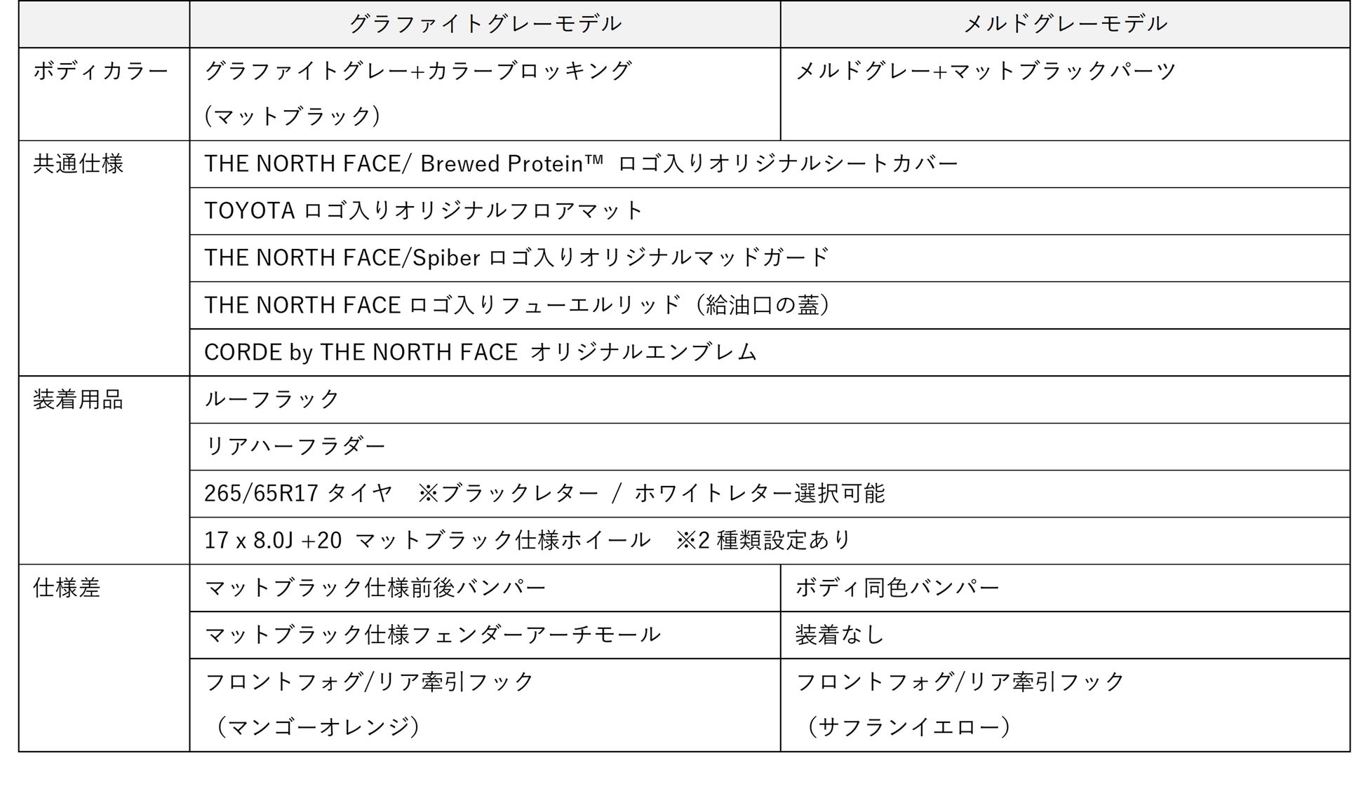 トヨタ・コニック・プロ株式会社(本社:東京都千代田区神田淡路町 2-101 ワテラスタワー、代表取締役社長:武田淳一郎、以下「トヨタ・コニック・プロ」)が、提供するスタイルドカーブランド「CORDE by<コーデバイ>」は、「THE NORTH FACE」「Spiber」とコラボレーションしたモデル