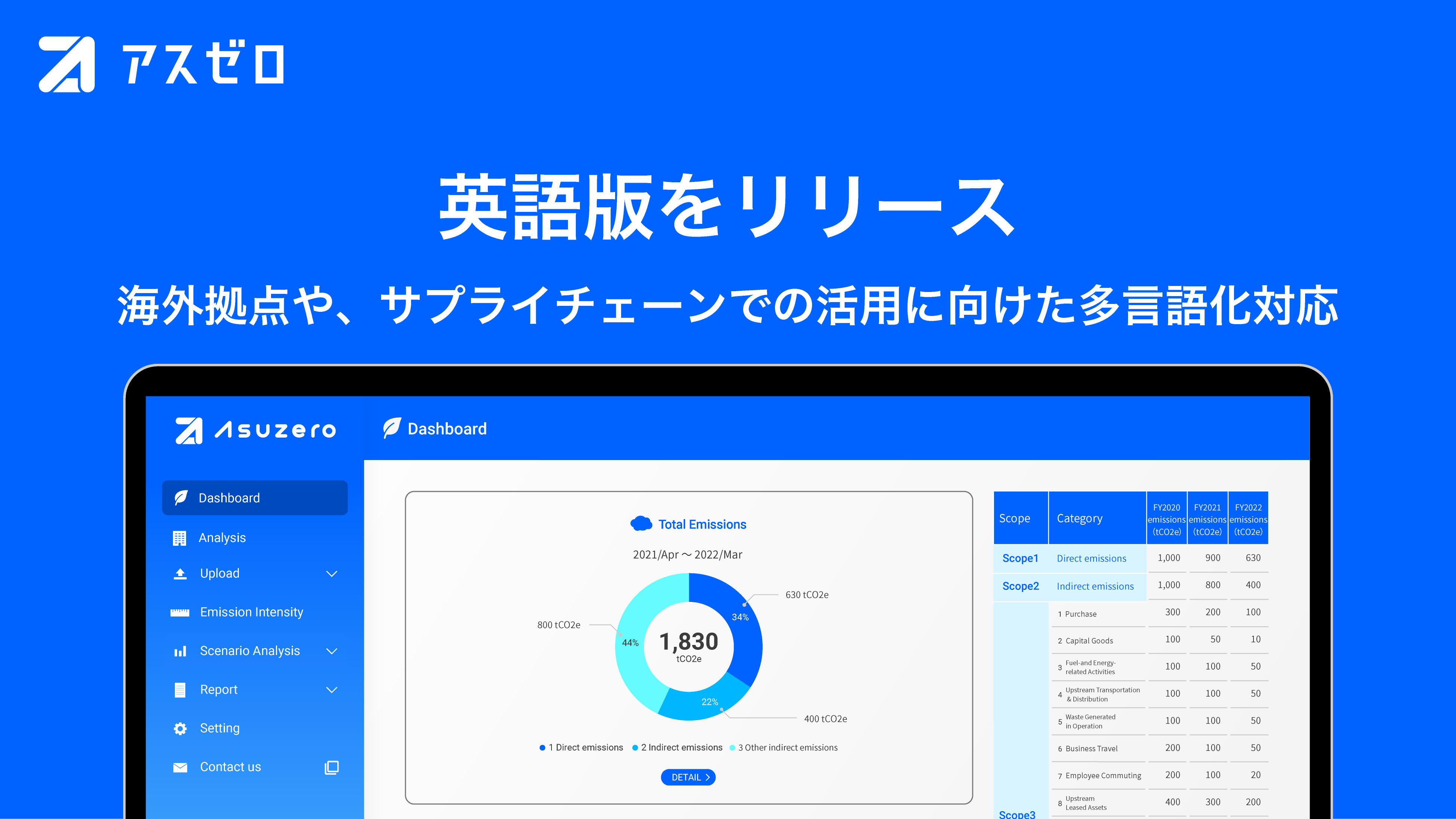 アスエネがCO2排出量見える化・削減SaaS「アスゼロ」のシステム英語版をリリース