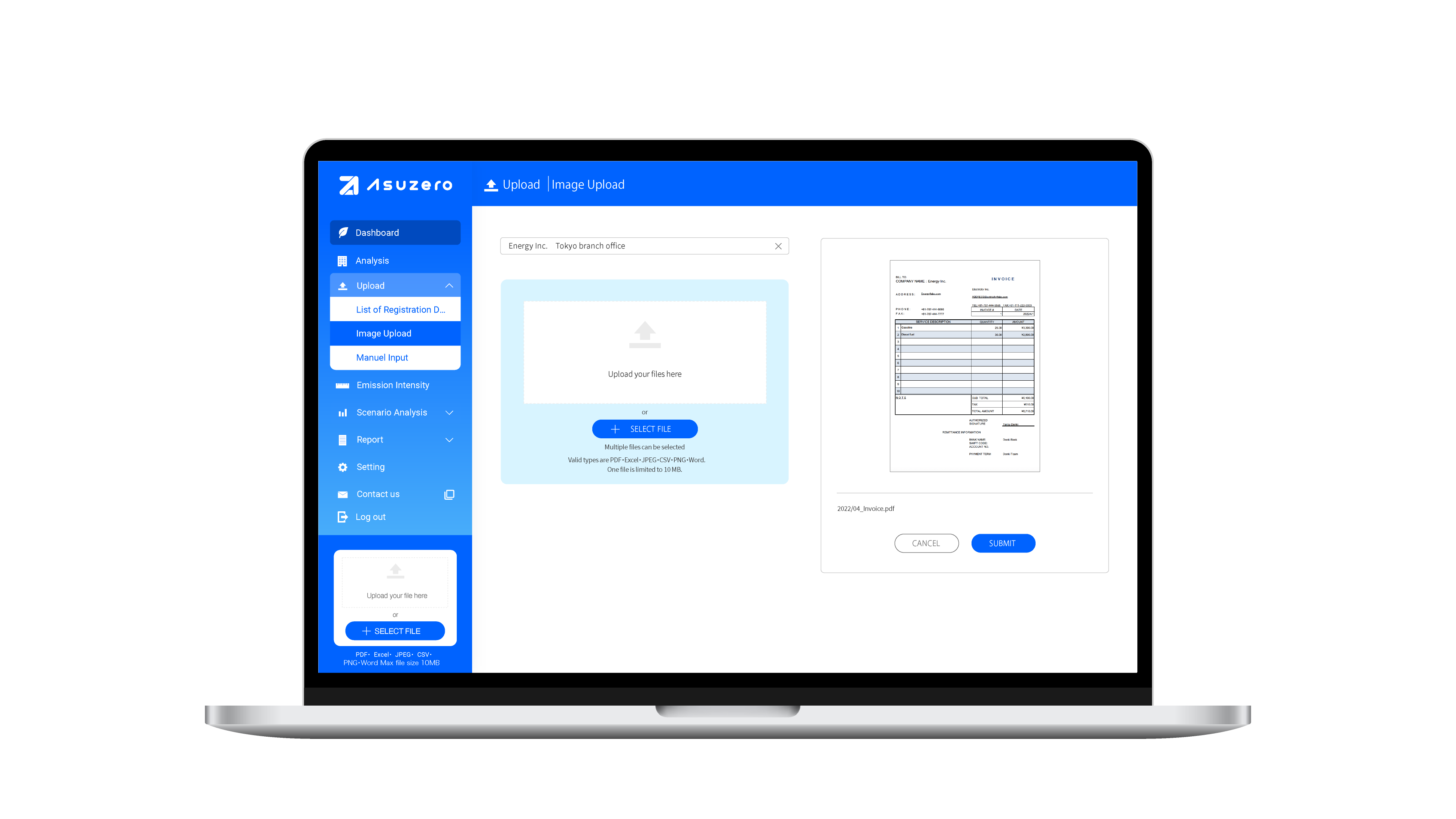 「アスゼロ」では、全プランのお客さまへ画像アップロード機能を提供しています。英語版(β版)においても、当社の強みである独自のAI-OCR技術を活用し、CO2排出量見える化に伴うデータ登録や算定業務の工数を大幅に削減可能です。当社は言語対応のご要望に技術開発の観点でお応えし、お客さまのグローバルな脱炭素経営業務の工数削減と最適化を実現します。