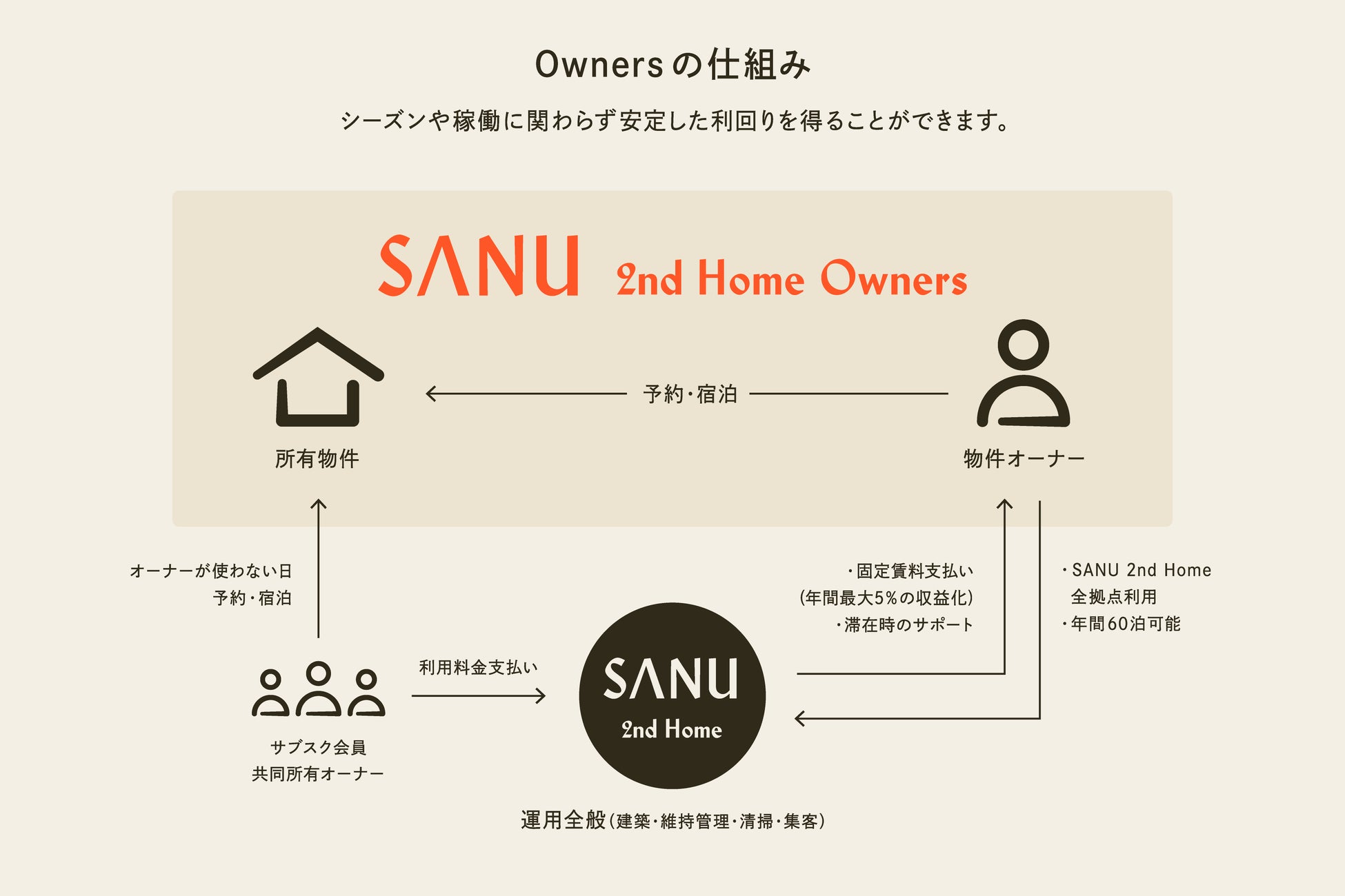 一方で、「もっと頻繁に通いたい」「本格的に二拠点生活を始めたい」「SANUの建築を所有したい」といった声も増加。そこで、利用と投資のメリットを融合した新しいモデルとして、『SANU 2nd Home Owners』が誕生しました。この新しい所有モデルでは、ご自身で利用しながら、SANUが管理・運用を行うことで資産運用も可能な“自然と深く結びつく暮らし”を提案します。