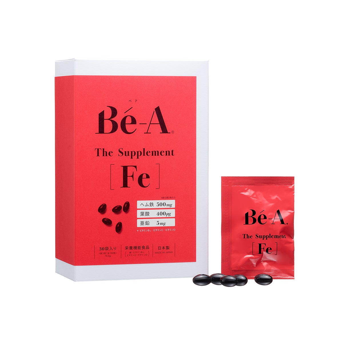 Bé-A〈ベア〉は、吸収率が高いへム鉄500mg(鉄10mg相当)を高配合。さらに、亜鉛、葉酸、ビタミンなど6種の栄養素もバランスよく届けます。体が重い、朝が苦手…