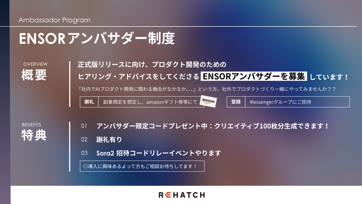 REHATCH株式会社は、「意思決定で、世界をうごかす。」をミッションとして、AI×データを活用し、マーケティングの変革を支援する企業です。現在開発中のマーケティング特化AIエージェント「ENSOR」を通じて、マーケターが定型業務から解放され、本来の価値創出業務に集中できる環境を提供してまいります。