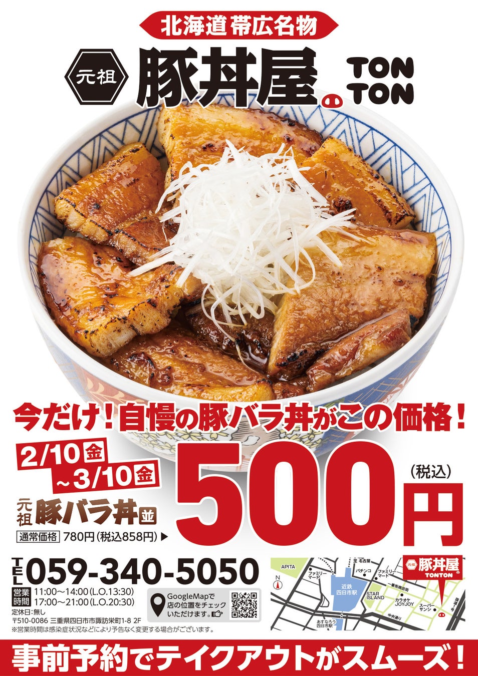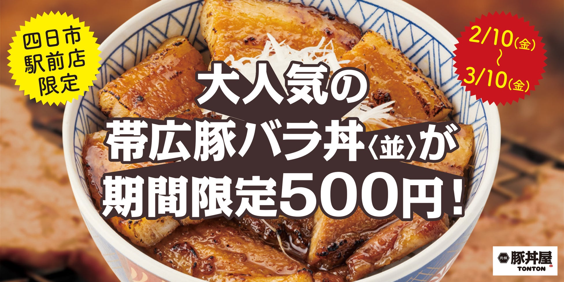 ボリュームたっぷりの北海道・帯広豚丼が人気の「元祖豚丼屋TONTON 四日市駅前店」(住所:三重県四日市市諏訪栄町1-8 2F、TEL:059-340-5050)では、2月10日(金)〜3月10日(金)の期間中「豚バラ丼【並】」を期間限定価格500円(税込)で提供いたします。