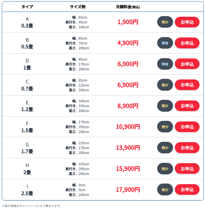 - 部屋タイプとサイズ、月額料金はこちら