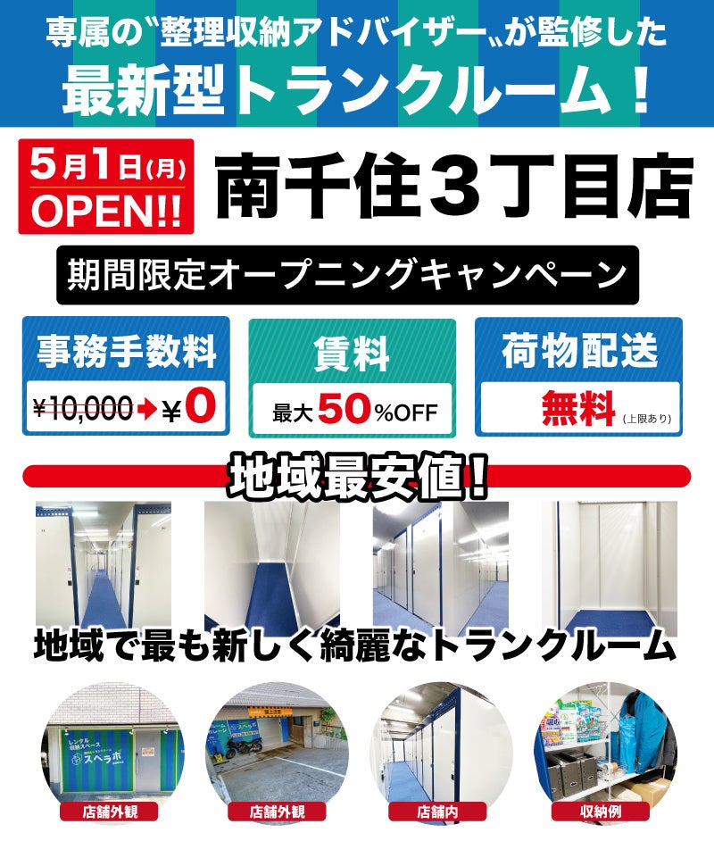 【5月1日(日)オープン】見学から契約、解約まで完全非接触・非対面、お申し込みからご利用まで最短1時間!都内にて絶賛運営中のトランクルーム【スペラボ】が荒川区南千住に出店!