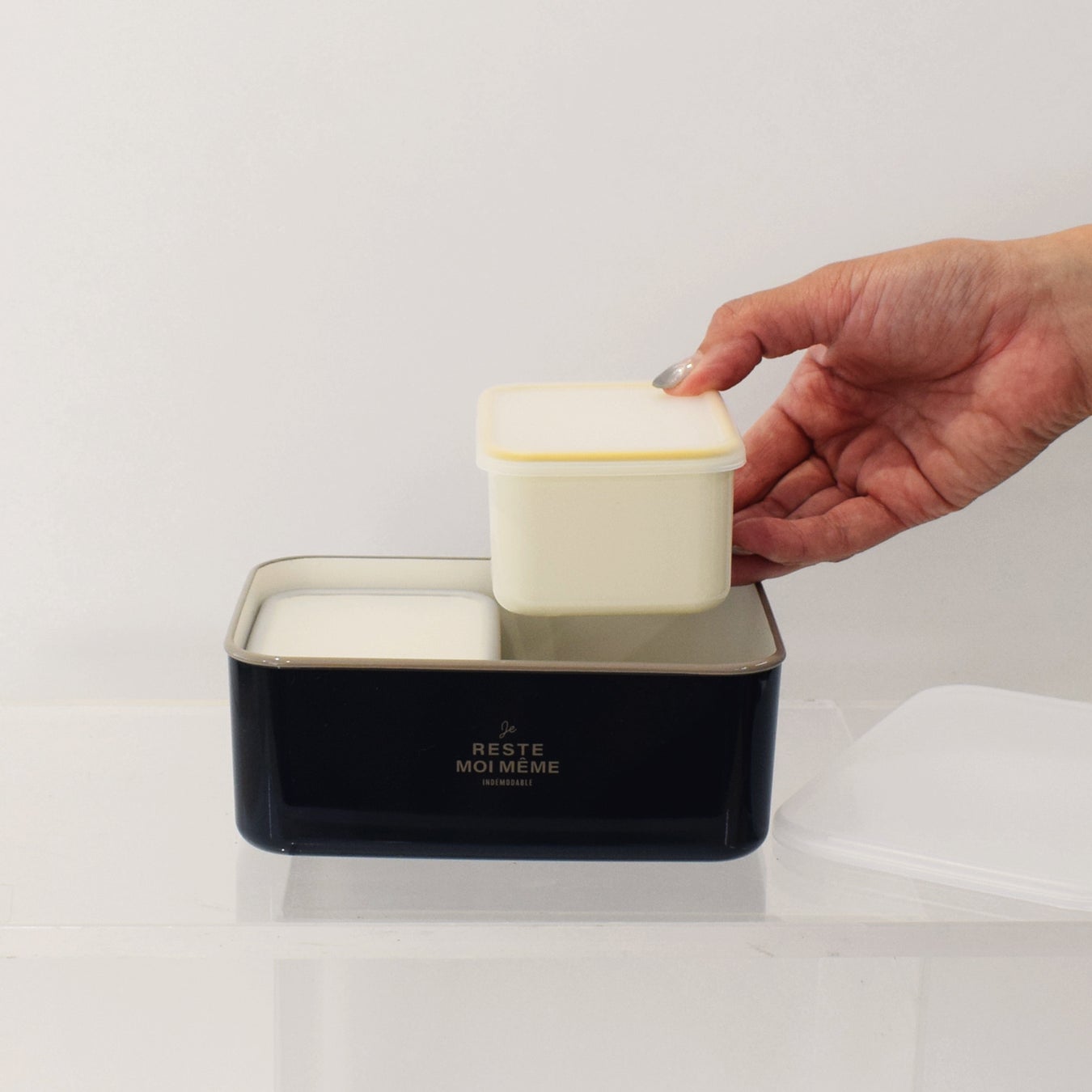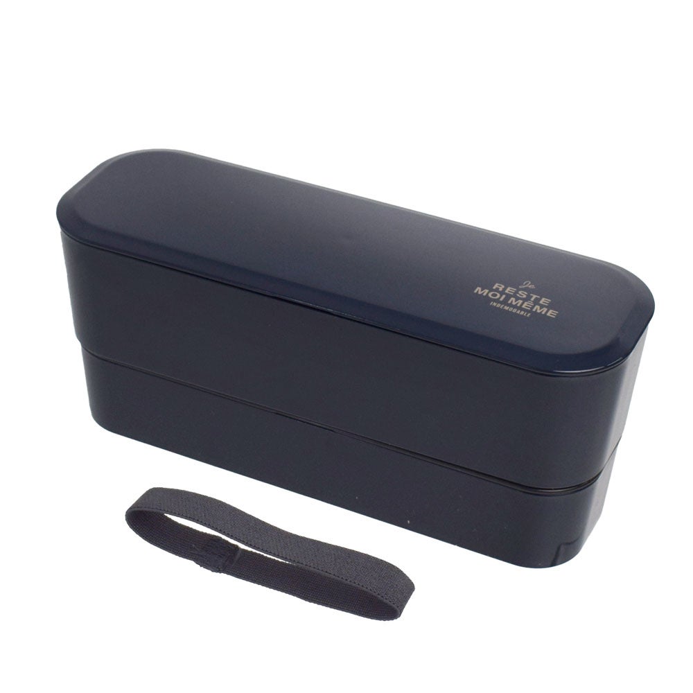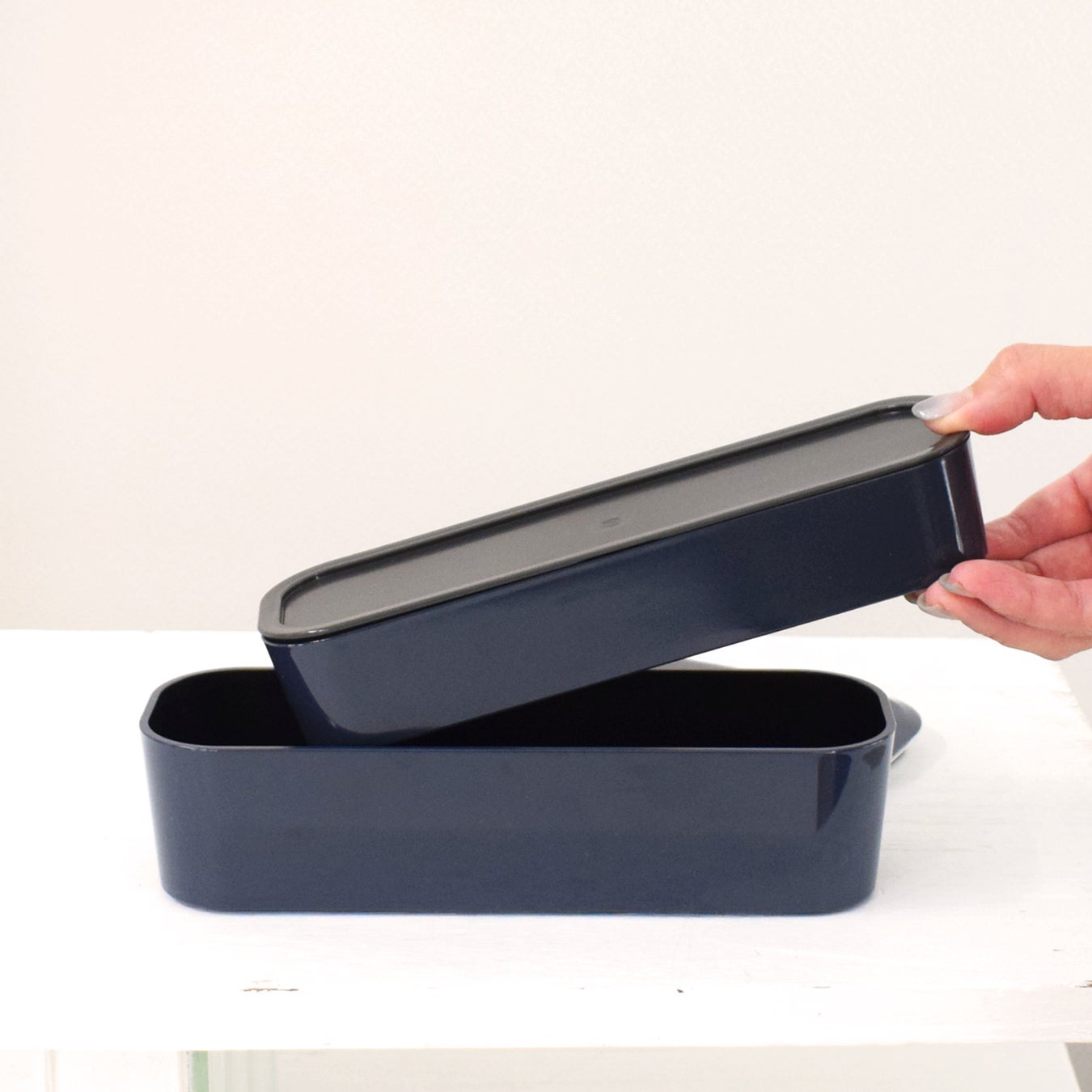 シンプル形状、たっぷり容量の2段ランチボックス。スリムな形状でかばんの中で邪魔になりにくい。食べ終わったあとはコンパクト収納ができてさらにすっきり。内側は黒色の樹脂を使用していて高級感アップ。汚れが気にならないのも嬉しいポイントです。