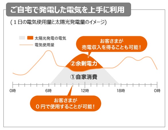 太陽光発電設備で発電した電気は、お客さま宅内で使い放題(1.自家消費 フリー)です。発電して使わずに余った電気(2.余剰電力)は、再生可能エネルギー固定価格買取制度※1等を利用して売電し、収入を得ていただくことも可能です。※2