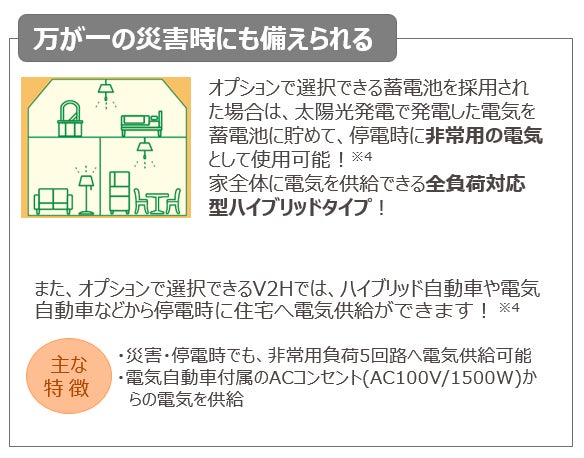 ※3 災害発生時のお客さま宅の設備状況等により、リース設備が利用できない場合があります。蓄電池、V2H、太陽光発電(パネル出力3kW以上10kW未満)は、オプションリース契約が必要です。