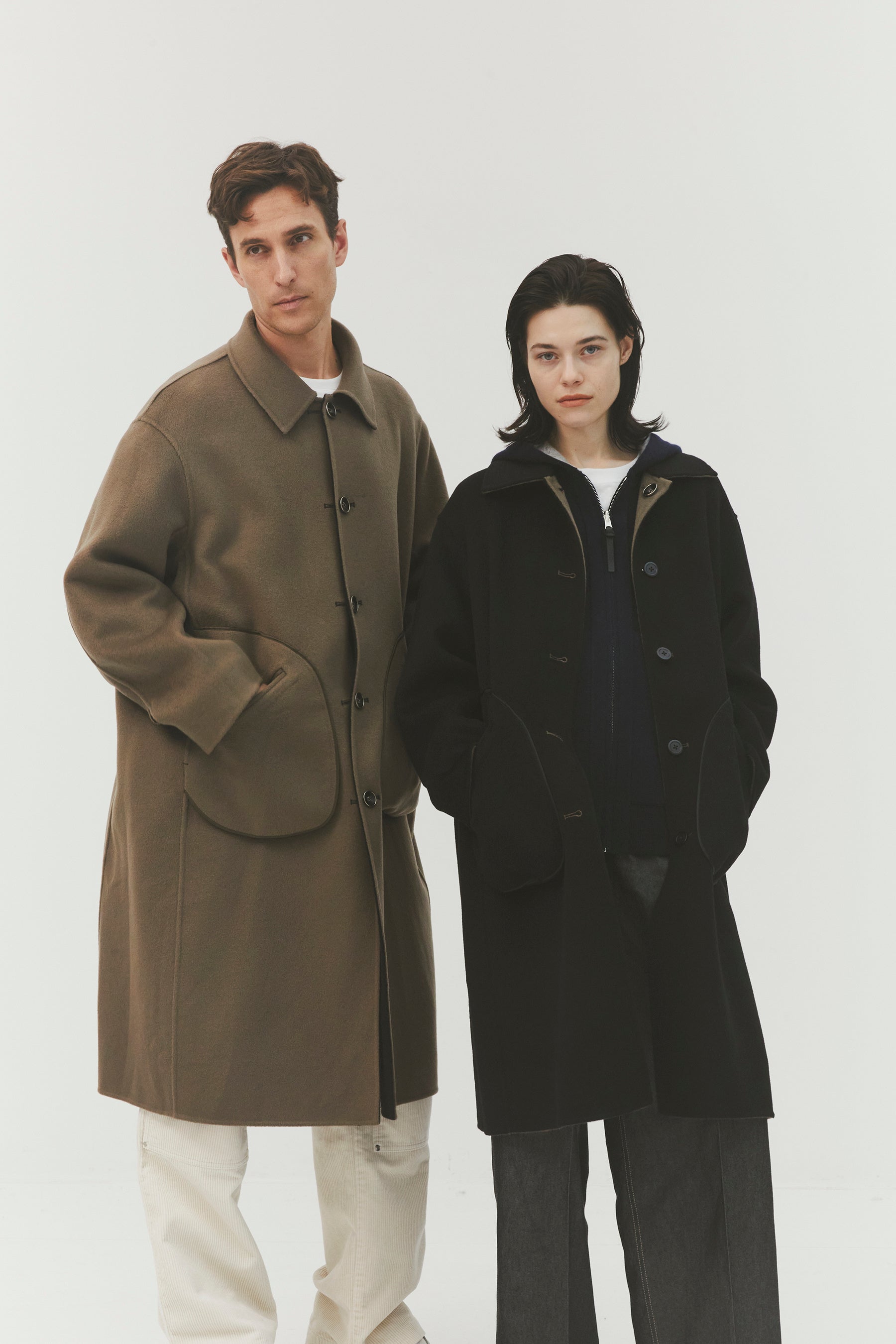 ・アウターではリバーシブルでの着用時、女性なら左、男性なら右にボタンを付け変えることができる仕様になっております。