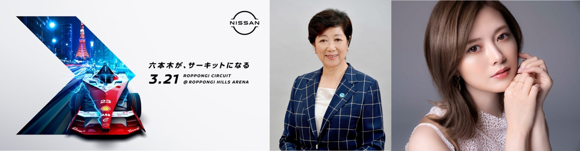 当日は、小池百合子都知事、日産自動車 副社長 星野朝子が登壇。特設ステージで大会への期待などをスピーチいたします。さらに、タレントの白石麻衣さんも「NISSAN FORMULA E ROPPONGI CIRCUIT」のスペシャルゲストとして応援に駆けつけます。特設ステージではトークセッションを行うほか、小池都知事やみなさまには声の力で電力を起こし、集まったエネルギーを日産フォーミュラEチームへ届ける「VOICE CHARGE」を体験いただきます。また19:30~20:00の30分間は一般の方もサーキット内周の特別観覧エリアから迫力あるスペシャルパフォーマンスをご覧いただけます。日産EVラインナップの展示や特別に設置したフォトスポットなどもお楽しみいただけますのでぜひお越しください。