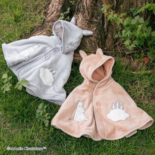 ちょこんと座ったムーミンと雲から顔を出すニョロニョロのアップリケがほどこされたケープです。雲型のポケットやフードの耳など、細部にまでこだわったアイテム。脇にはムーミンのピスネームをあしらいました。