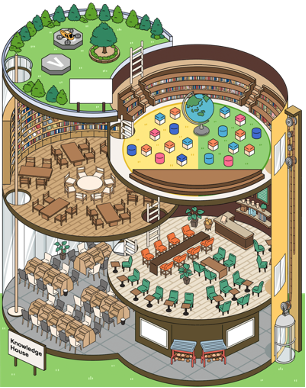 中高生の自習については、一人ではやる気がわかずモチベーションが維持できないなどの課題があります。カフェにPCを持ち込み、仕事をする大人が増えているのも、同じような事情かもしれません。「WAO 25」では、仲間の存在を感じながら勉強し、時には近くの先生に相談したりできる、オンライン自習室専用校舎の <Knowledge House(ナレッジハウス)>に集まることで、孤独ではないが集中できる環境を創ります。また、<Knowledge House>には、その日の目標を宣言するフリーボードがあり、入室時に書き込むことで意欲が高まります。また、ライブラリー、カフェ、パーソナルの3つのルームがあり、その日の目的や気分に合わせて選ぶことが可能です。