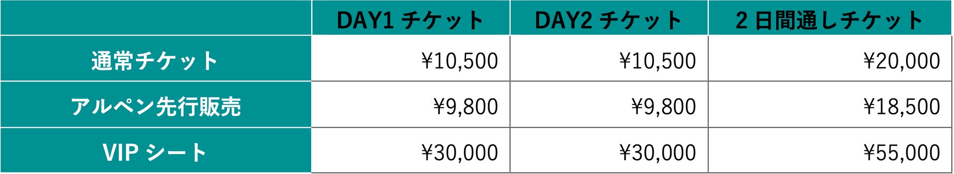 ・通常料金:ブロック指定 10,500円/2日間通し券 20,000円(いずれもゴンドラリフト往復乗車、5線サウスリフト乗車込、入場時別途ドリンク代600円必要)