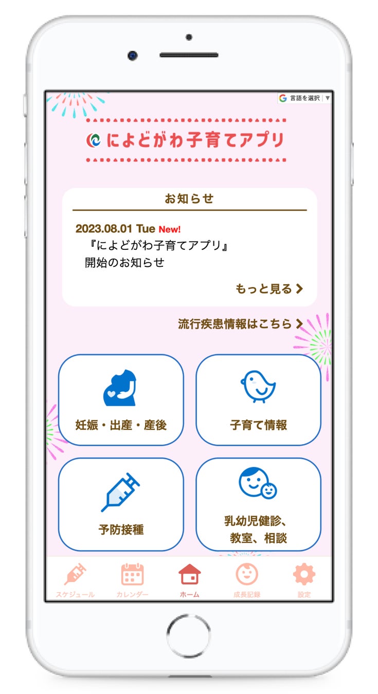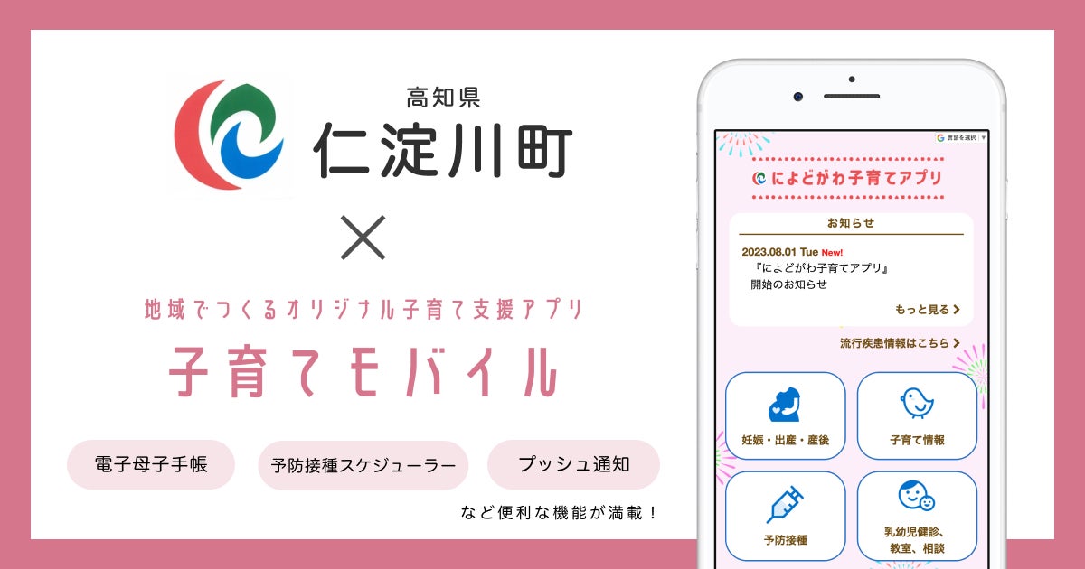 ライフスタイルの多様化による子育て世代のニーズの変化に伴い、一人一人の状況に合わせた子育て情報の発信やプッシュ通知、簡便な予防接種スケジュールツールを提供するため、子育て支援アプリ「子育てモバイル」を導入する運びとなりました。仁淀川町オリジナルのデザインを施し、子育て支援アプリ「によどがわ子育てアプリ」として提供いたします。
