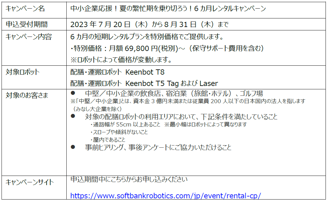 昨今、飲食店への客足が回復する一方で、人手不足の深刻化が不安視されています。当キャンペーンは繁忙期における人手不足やサービスの品質にお悩みを抱える中小企業を対象としています。ぜひこの機会に配膳・運搬ロボットの導入をご検討ください。
