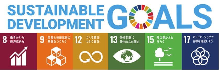 SDGsへの取組み:弊社サービスは主に8,9,12,13,15,17のテーマの取り組みを推進しています。