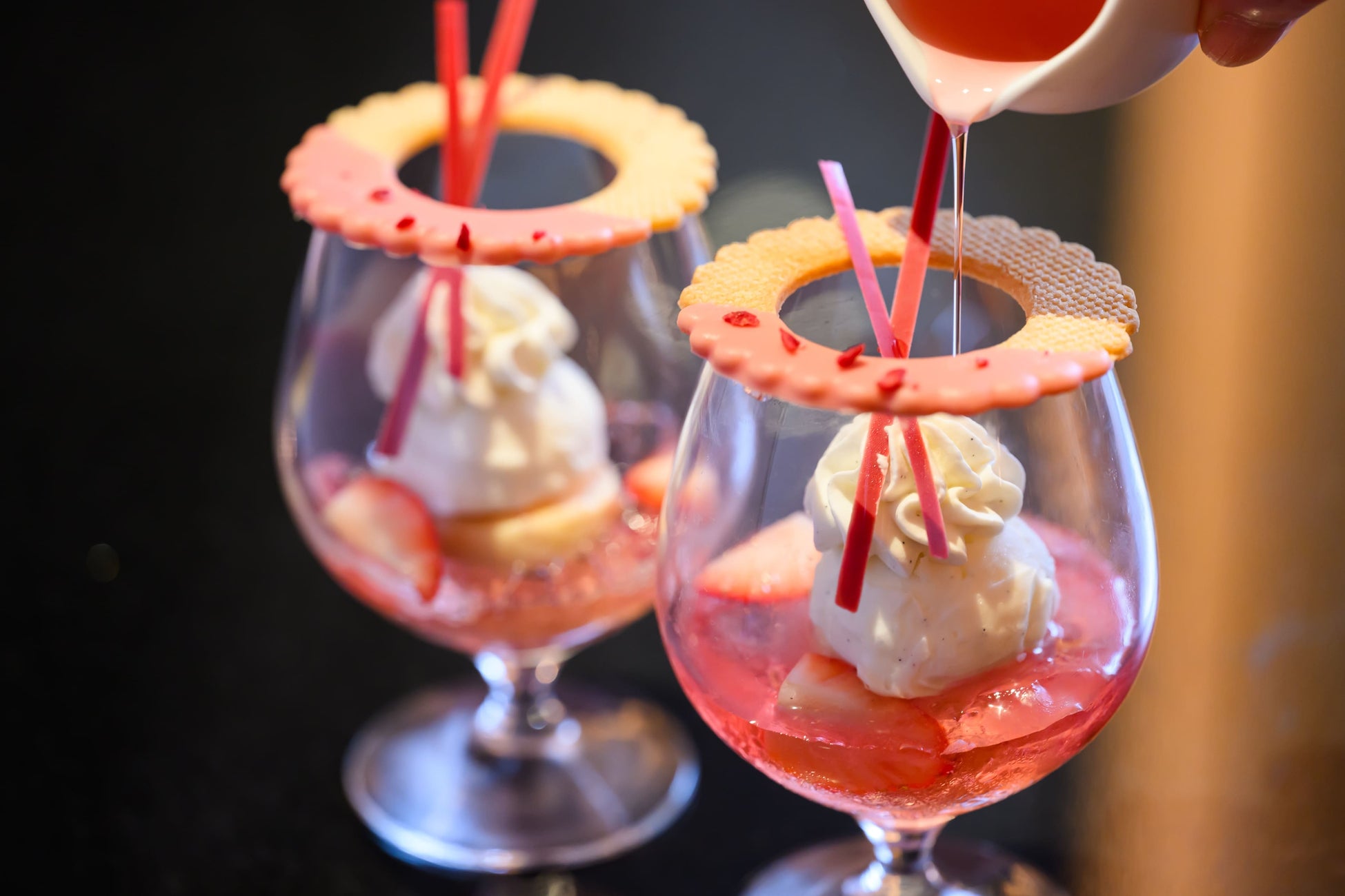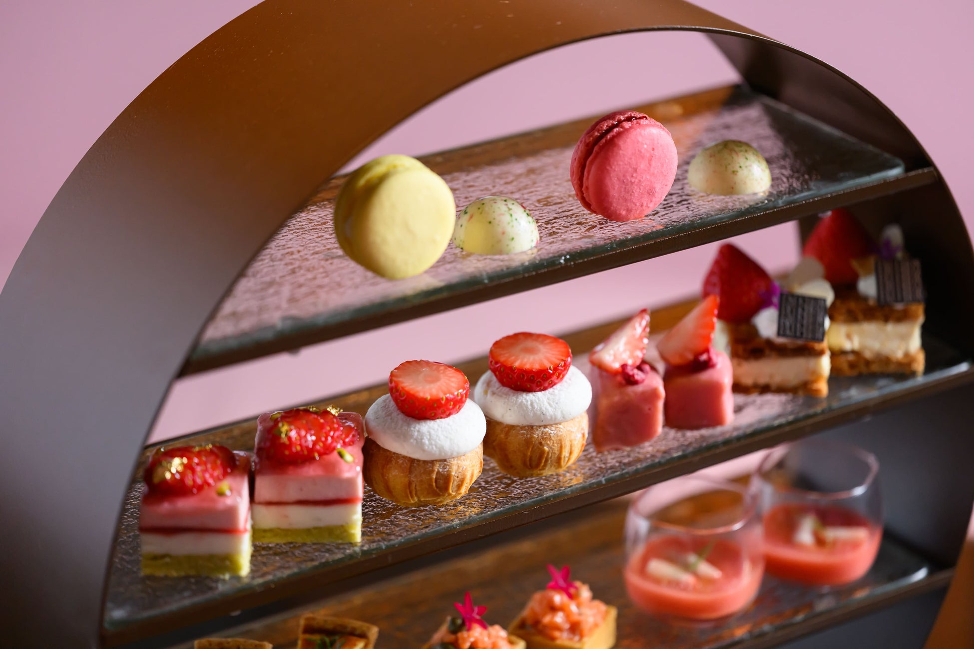 赤く輝く宝石のようなあまおうがアフタヌーンティースタンドを彩り、いちごのフレッシュな香りと口いっぱいにじゅわっと広がる果汁、熟したあまおうの味わいが溶け合う絶品メニューで皆様をお迎えいたします。フレンチのテクニックでスイーツとセイボリーへと昇華された、甘酸っぱくもジューシーなあまおうの味わいを存分にご堪能ください。今期のミニパルフェでは、ピンクのシロップをかけて、あまおう、アイスクリーム、生クリームの調和を感じていただけます。セイボリーには福岡県の明太子を使用したメニューも加わり、あまおう以外の福岡県のグルメも登場します。