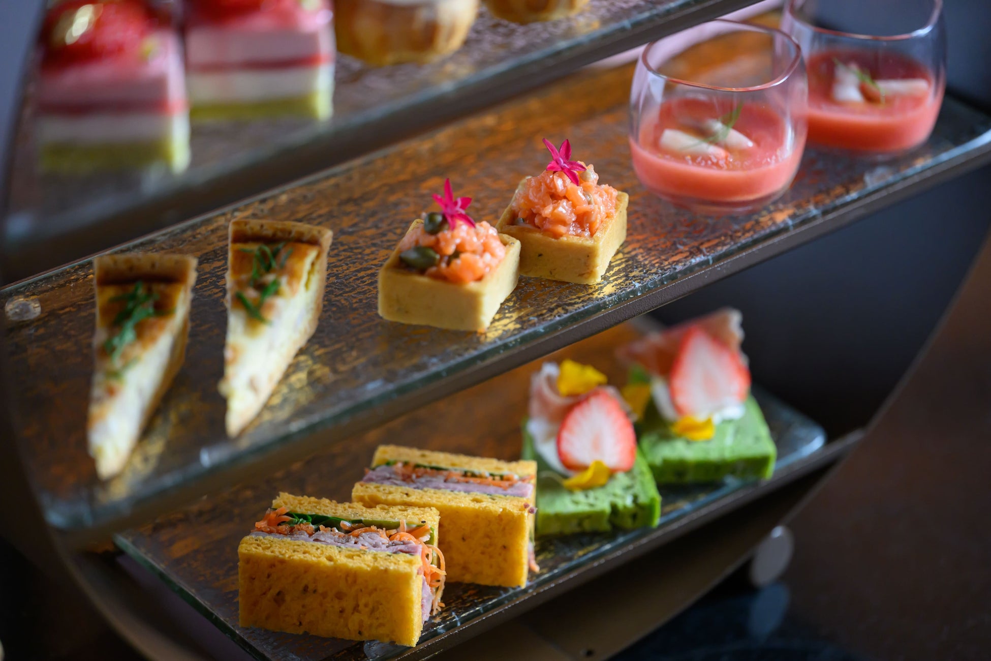 <セイボリー>あまおうとトマトのスープ/あまおうと生ハム、ほうれん草のケークサレ/キッシュロレーヌ/スモークサーモンのタルタルと明太子のクリーム/パストラミと人参のサンドイッチ