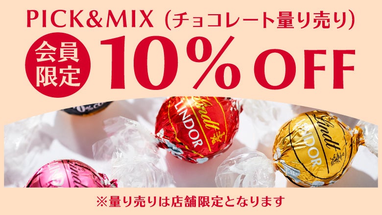新たにMy Lindt Club(マイ リンツ クラブ)のメンバーにご登録いただいた方には、期間限定で通常よりもお得な入会特典のクーポンをご用意しております。この機会にぜひご入会いただき、お得にお買い物をお楽しみください。(PICK&MIX 300g以上10% OFFのボリュームディスカウントと併用可)