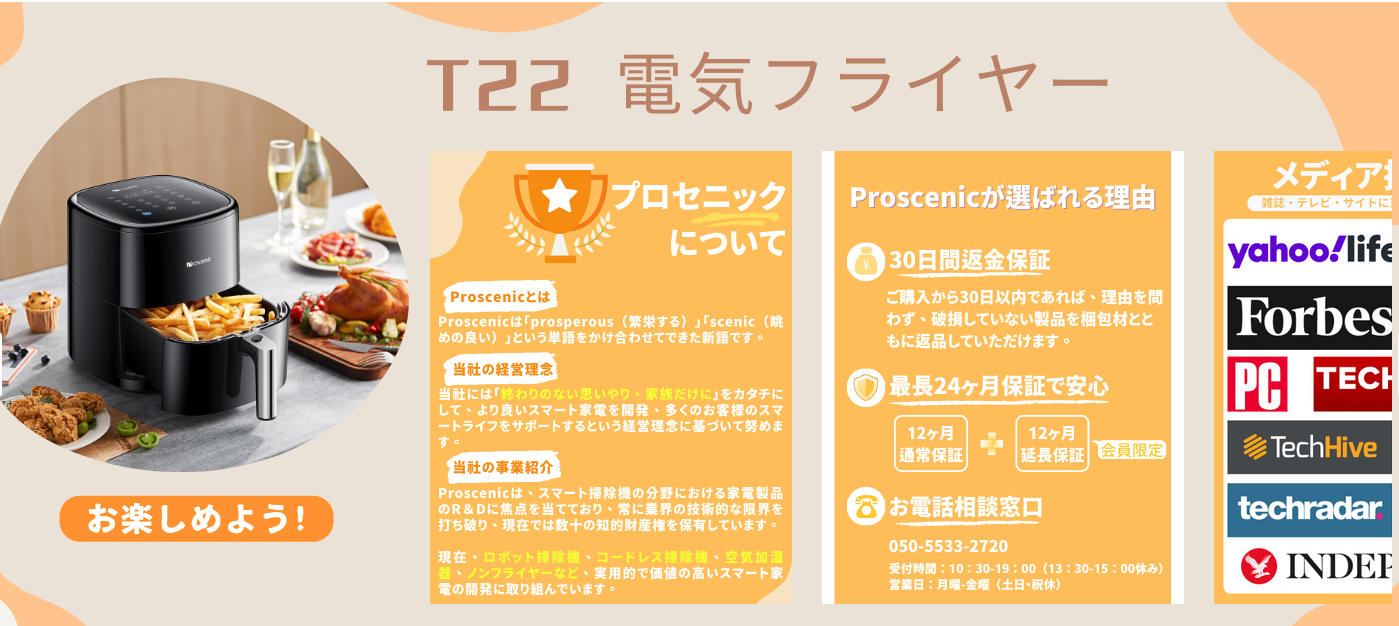 ノンフライヤー、空気清浄機、ロボットやコードレス掃除機などの研究開発、生産、販売を一体化した家庭用家電の総合メーカーであるプロセニック株式会社は、9月8日(木)8:00から9月8日(木)20:00まで合計12時間にわたって、Amazonにおいて、人気商品T22ノンフライヤーが全年最低価格となる特別セールを実施致します。