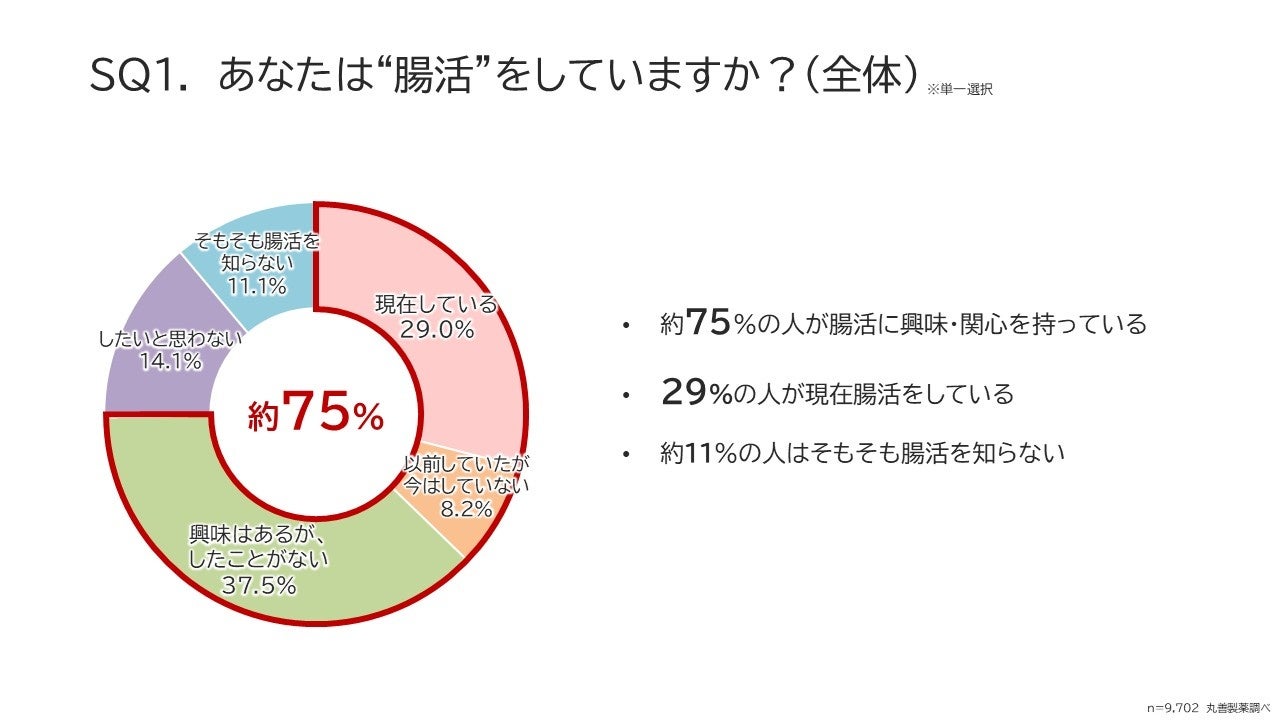 20〜60代の男女9,702名を対象とした一次調査において、29%が「腸活をしている」と回答。また、約75%が腸活に興味を持っていることが分かりました。