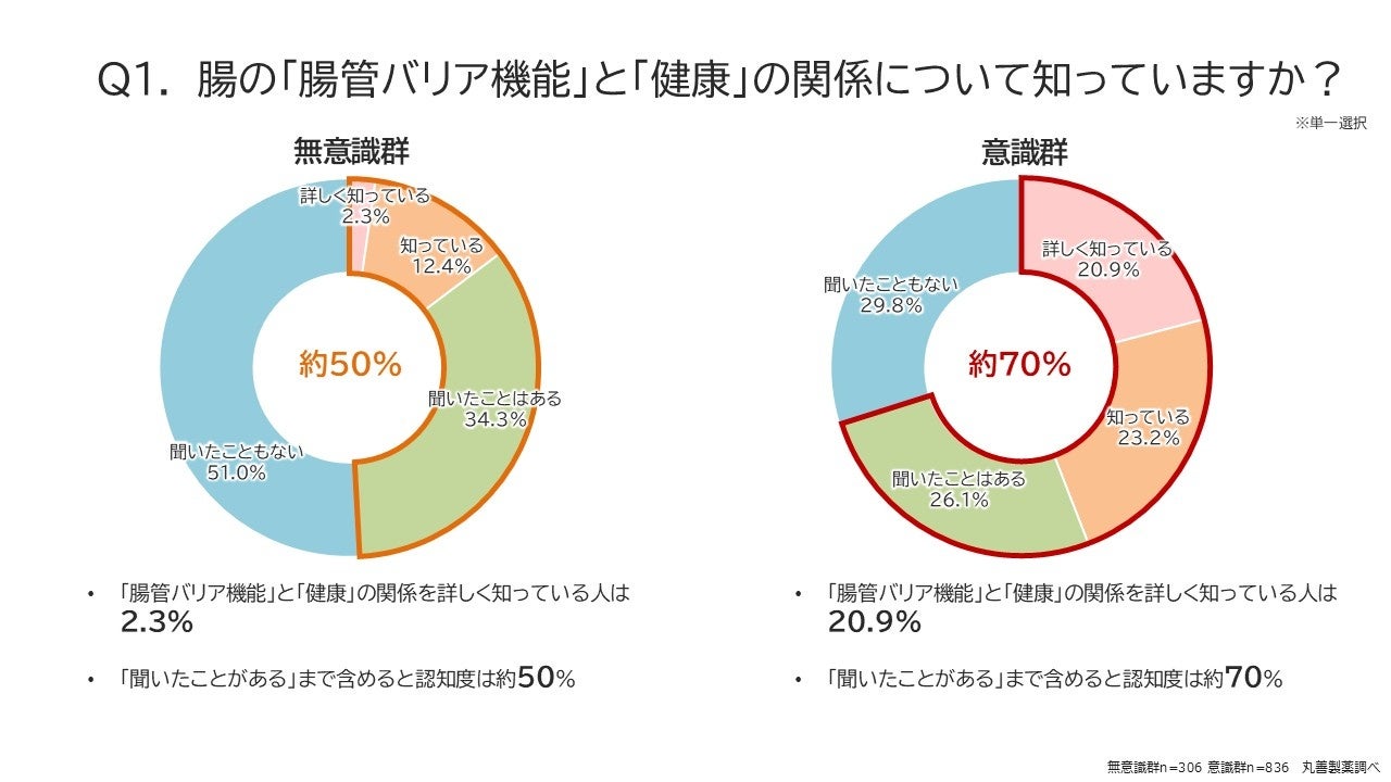 本調査では、意識的に腸活を行っている群では、腸管バリア機能と健康の関係について「詳しく知っている」と答えた人が20.9%で、無意識群の2.3%に比べて約10倍の認知度となりました。