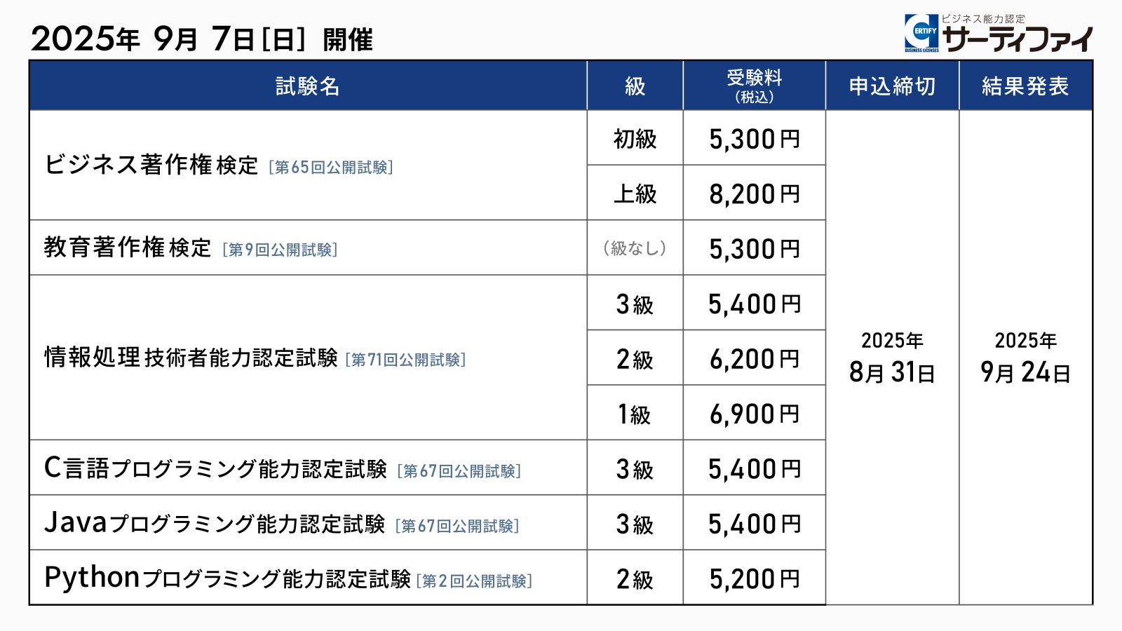 株式会社サーティファイ(本社:東京都中央区、代表取締役:瀧澤茂、以下「サーティファイ」)は、2025年9月7日(日)に開催する「ビジネス著作権検定」「教育著作権検定」「情報処理技術者能力認定試験」「C言語プログラミング能力認定試験」「Javaプログラミング能力認定試験」「Pythonプログラミング能力認定試験」の公開試験の申込受付を2025年6月24日より開始しました。