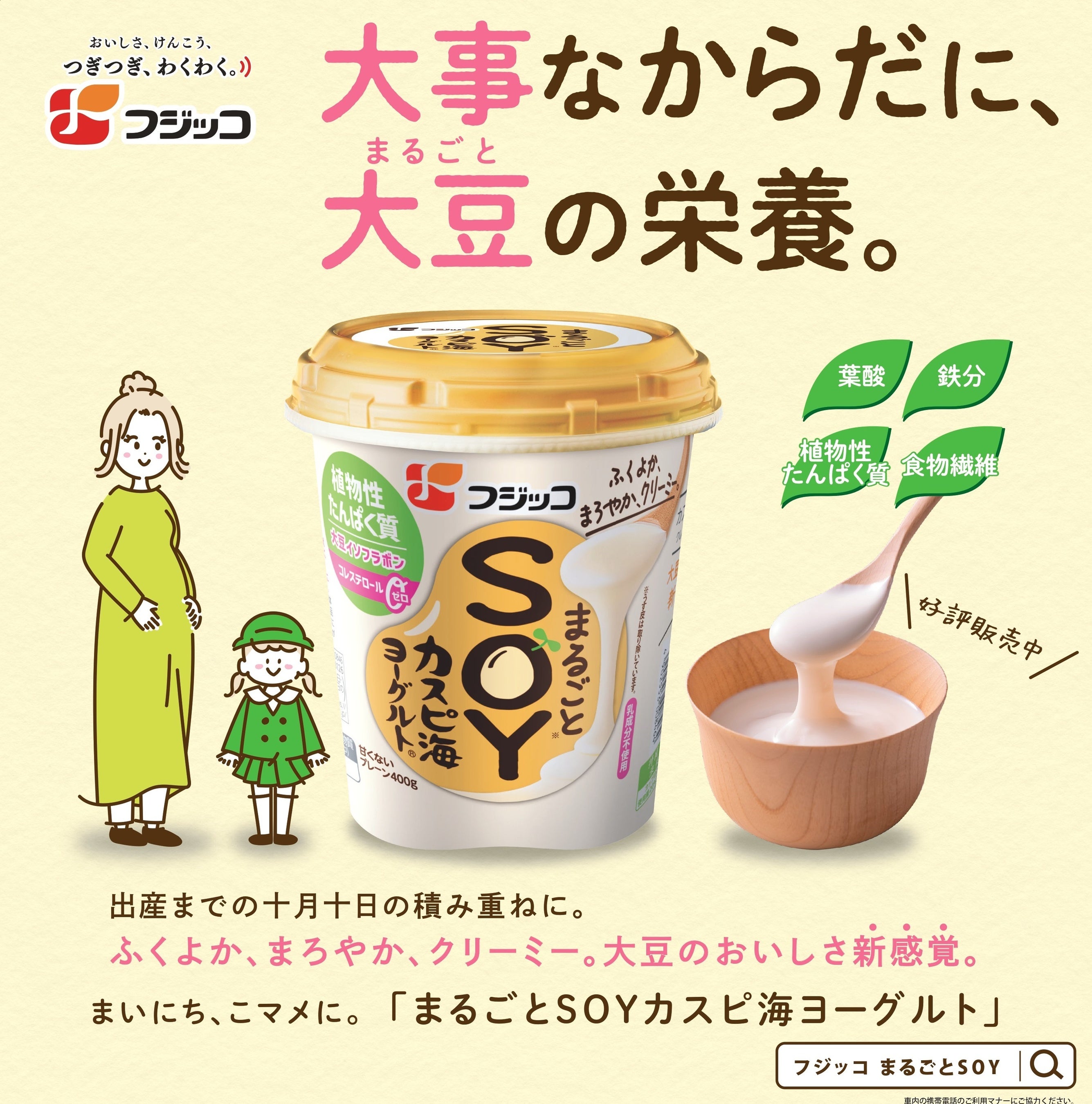 フジッコ商品である「まるごとSOYカスピ海ヨーグルト」は、独特のとろ~りクリーミーな食感と酸味の少ないまろやかな味わいが特徴の、大豆をまるごと使った植物性ヨーグルトです。妊産婦さんに大切といわれている葉酸、鉄、たんぱく質などを含む大豆をまるごと使用しており、毎日の食事から大豆に含まれている栄養を手軽においしく摂ることができます。