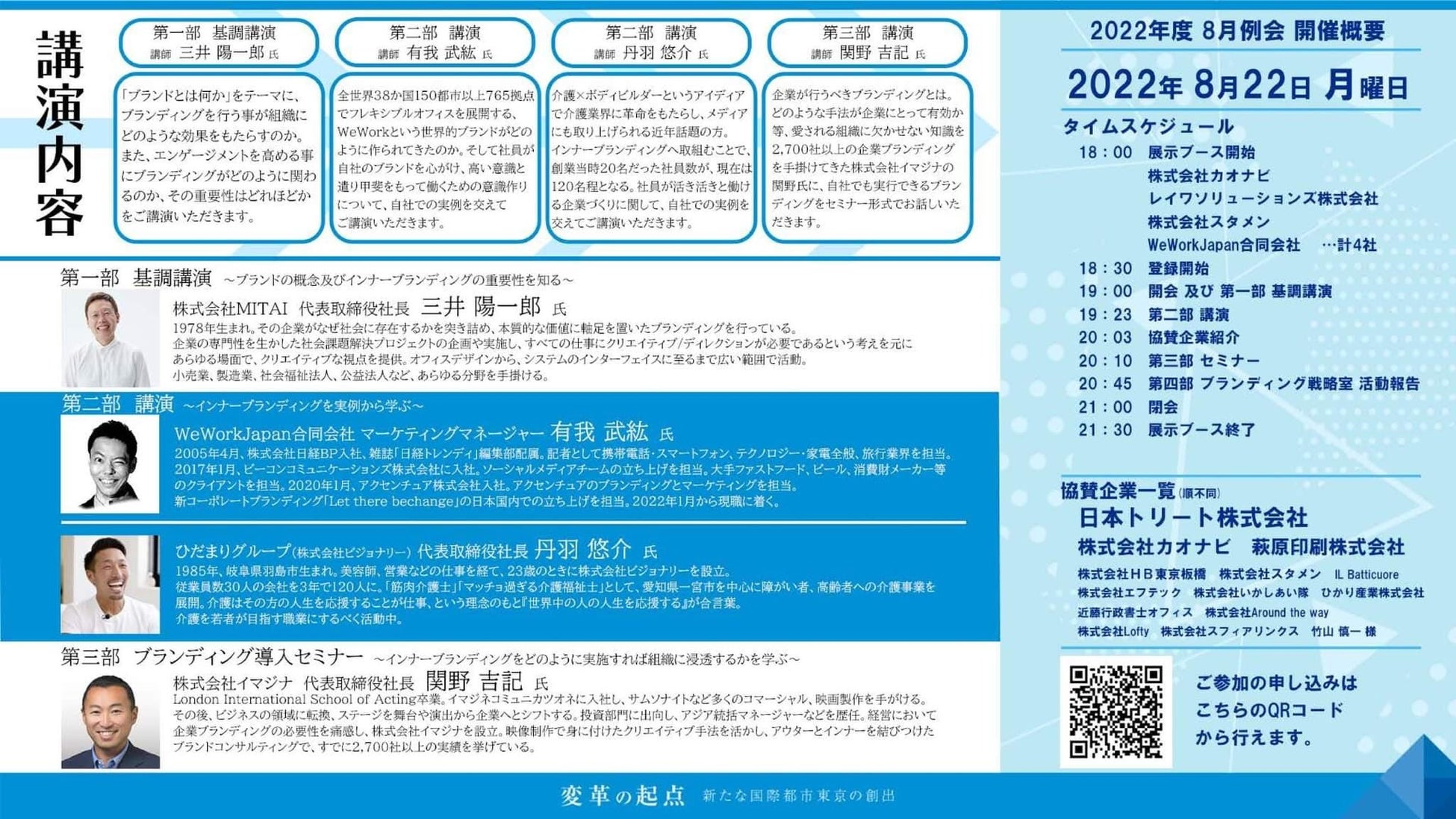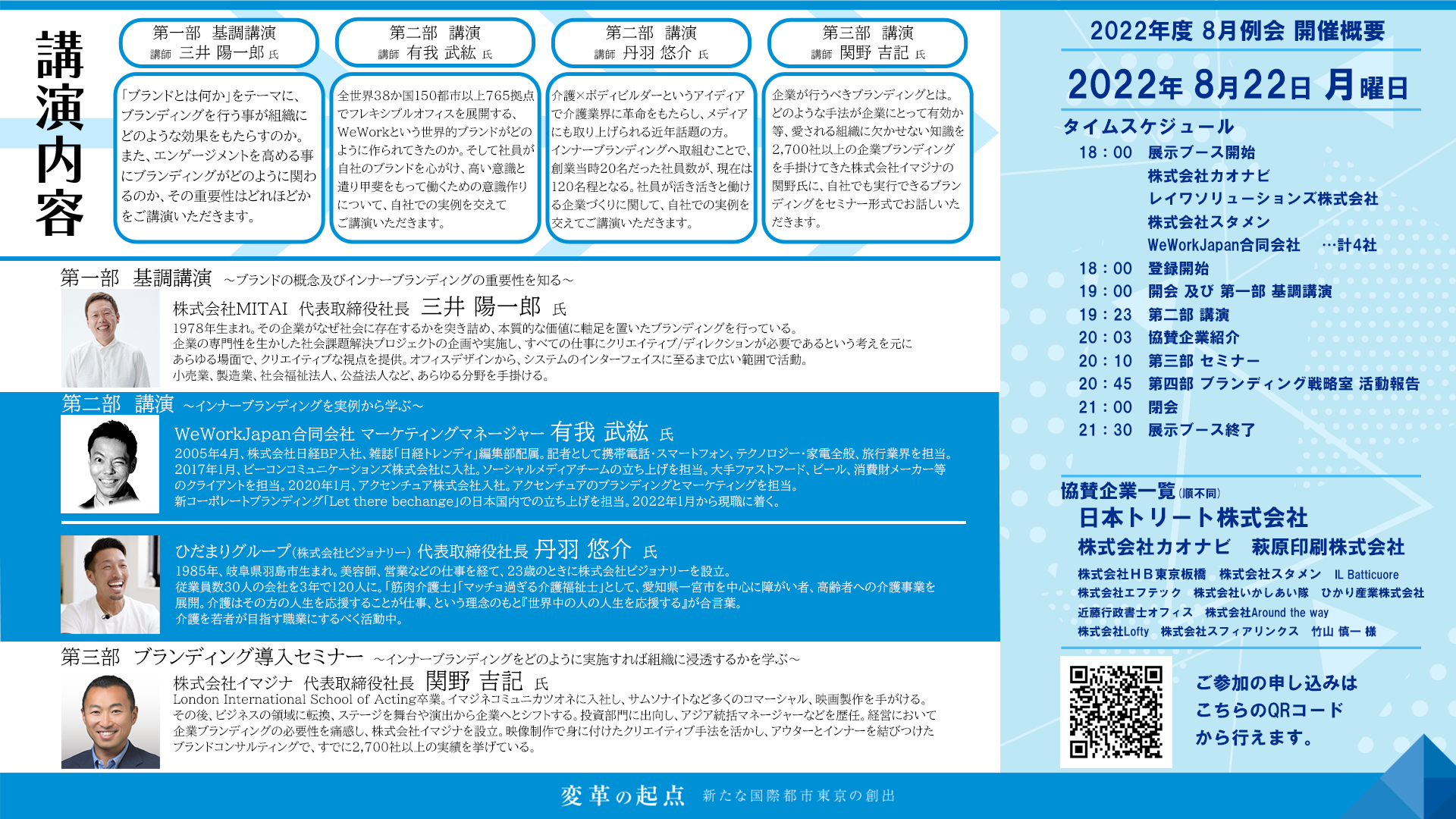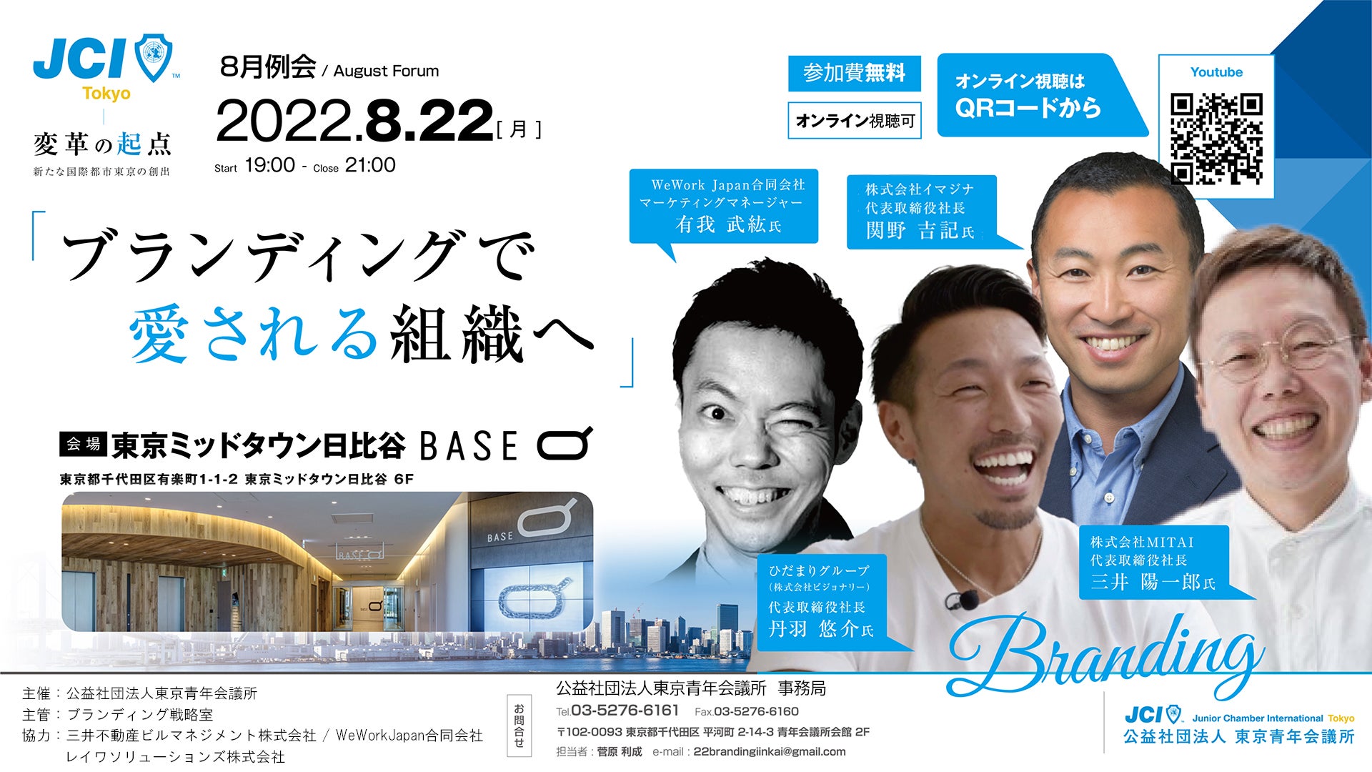 公益社団法人東京青年会議所(所在地:東京都千代田区平河町、理事長:山本健太)は、2022年8月22日(月)19時00分から「8月例会~ブランディングで愛される組織へ~」を東京ミッドタウン日比谷BASEQ-QHALL1+2(東京都千代田区有楽町1丁目1ー2)で開催します。また当日はYouTubeにて生配信を行い、事業開催後にはアーカイブ配信も行います。※参加費無料