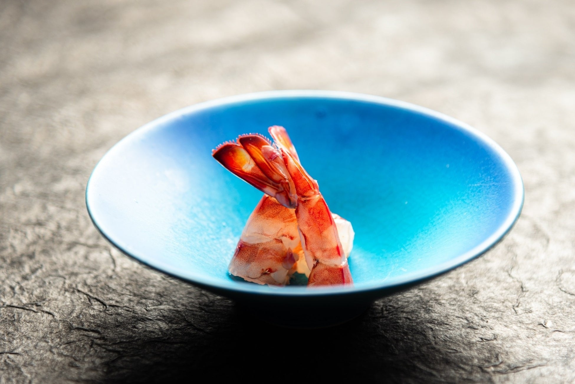 生きている状態でくしで打ち、ボイルしたエビを中はレア状態で楽しめる、エンタメ性ある別邸でしか味わえない商品。