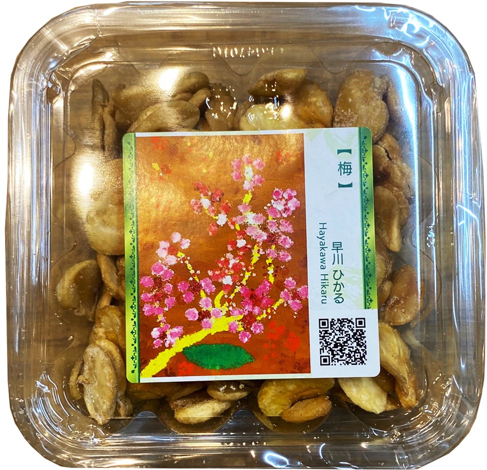 特長 :東大阪市に拠点をもつ、「障がい児者 総合福祉施設ノーサイド」さんの中で活動されている「ノーサイド横沼」のアーティスト達によって描かれた絵画作品がデザインされた特別仕様です。大粒の柔らかいオーストラリア産の皮むきそら豆をカラっと揚げ、紅岩塩で味付けし仕上げました。家呑み、お酒のお供におススメです。