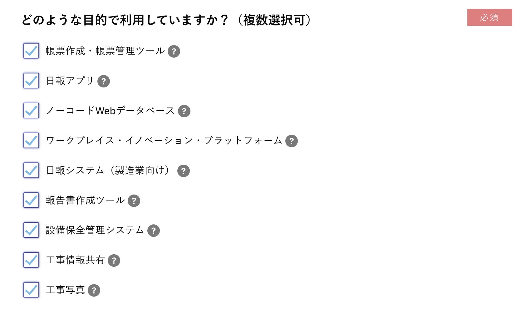 ★下記の「どのような目的で利用していますか?」の質問には、ご利用機能を漏れなくチェックしていただくようお願いします。