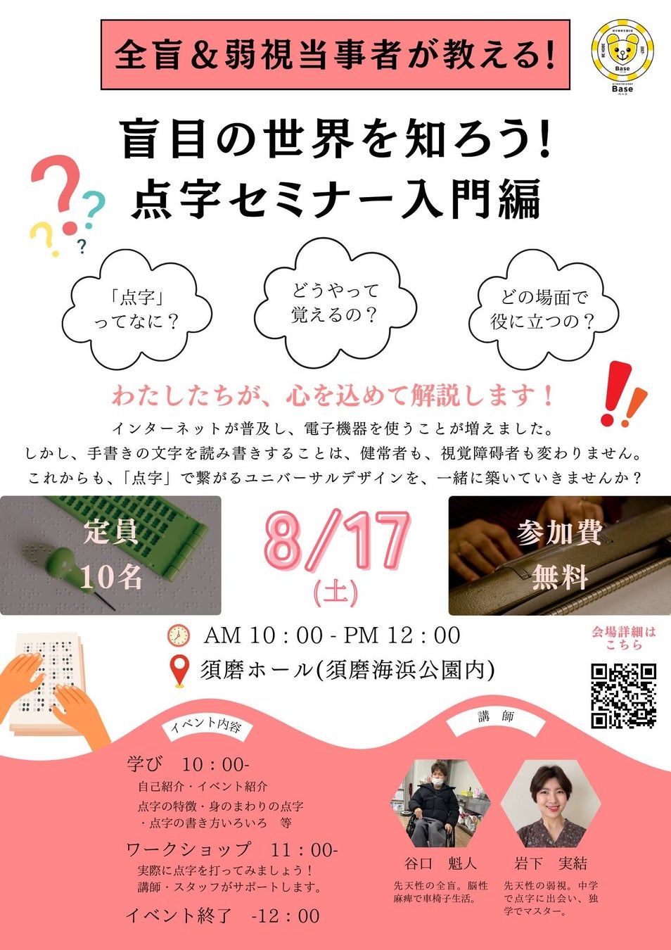 NPO法人須磨ユニバーサルビーチプロジェクトが運営する就労継続支援B型事業所Base(ベース)は、8/17(土)10時~12時に須磨ホールにて、「盲目の世界を知ろう!点字セミナー入門編」を開催します。本イベントでは、全盲と弱視の講師2名が、点字について解説を行い、点字に実際に触れることのできるワークショップも行います。