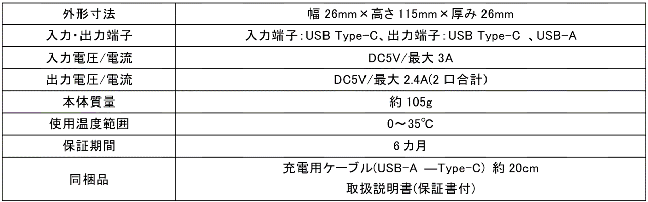 容量5,000mAhでスマートフォンを約2回充電(*1)でき、USB Type-Cでの入力・出力対応(*2)