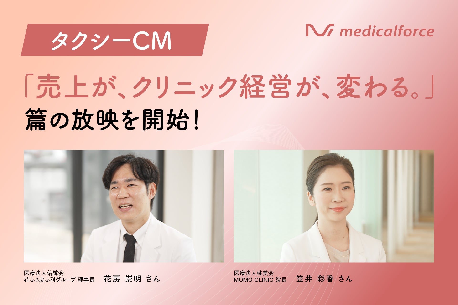 本CMでは、「売上が、クリニック経営が、変わる。」というメッセージを軸に、medicalforceがクリニック現場にもたらす変化を、実際に導入されている医師のリアルな声を通じて描いています。出演いただいた花ふさ皮ふ科グループ様、MOMO CLINIC様は、それぞれ異なる診療スタイル・運営形態の中で、medicalforceの操作性やサポート体制、予約管理や経営管理機能、保険・自費の一元管理による業務効率化を実感されています。