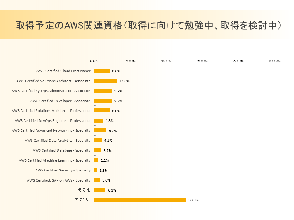 対象のエンジニアのうち、半数近くが何らかの AWS 資格を取得しており、最も取得割合が高かったのは「AWS Certified Cloud Practitioner」で22.3%でした。また、取得予定の AWS 資格を尋ねたところ、こちらも約半数が何らかの資格取得に向けて勉強中もしくは検討中と回答し、最も多かったのは「AWS Certified Solutions Architect - Associate」でした。