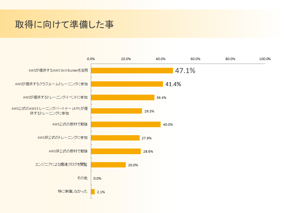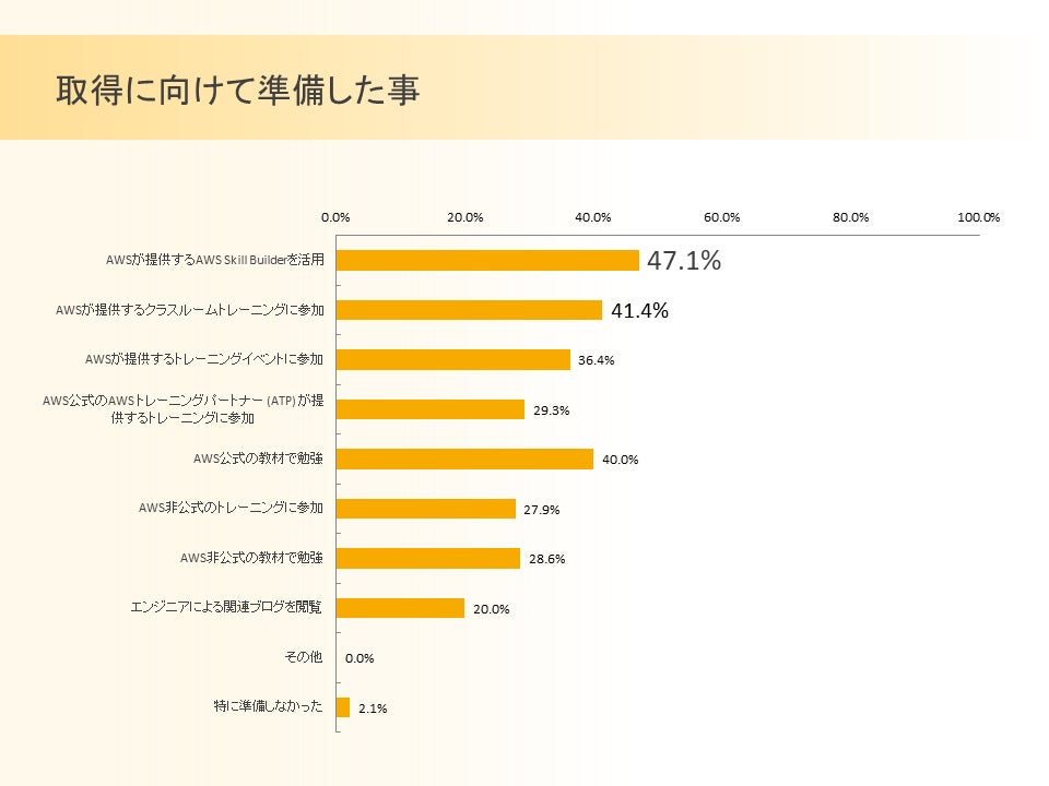 AWS 資格取得者と取得に向けて準備・検討しているエンジニアに、資格に向けた準備について尋ねたところ、最も多かったのが「AWSが提供する AWS Skill Builderを活用」で47.1%、続いて「AWS が提供するクラスルームトレーニングに参加」で41.4%でした。