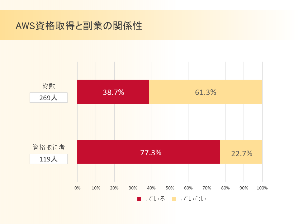 また、AWS 資格取得と副業の関係性について調べたところ、資格取得者のうち77.3%が副業をしていると回答し、副業も資格取得者の高年収の要因となっている可能性があることがわかりました。