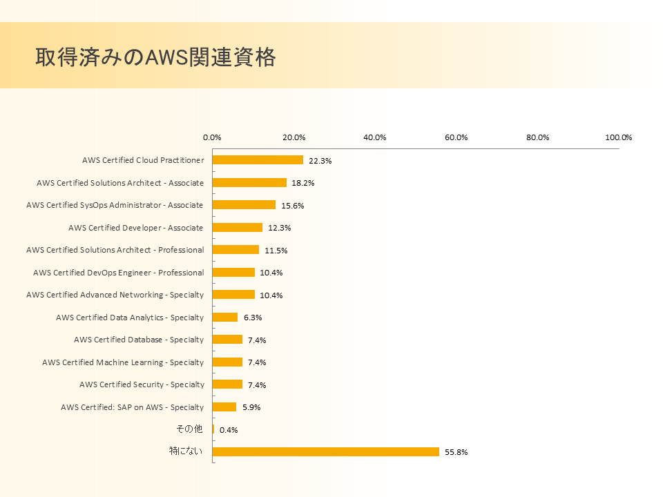 ・対象のエンジニアのうち、半数近くが何らかの AWS 資格を取得。最も取得割合が高かったのは「AWS Certified Cloud Practitioner」で22.3%