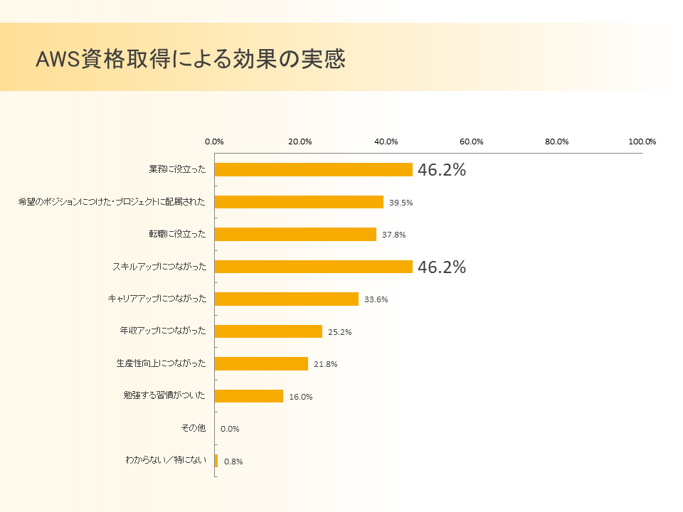 AWS 資格取得済みのエンジニアに取得してよかったと思うかを尋ねたところ、97.4%が「とてもよかった」もしくは「まぁよかった」と回答しました。資格取得による効果については、「業務に役立った」「スキルアップにつながった」の回答がいずれも46.2%、「希望のポジションにつけた・プロジェクトに配属された」が39.5%でした。「わからない/特にない」の回答はわずか0.8%で、ほとんどのエンジニアが資格取得に具体的な効果を感じていることがわかりました。