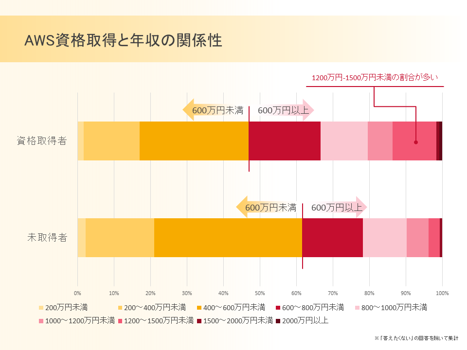 次に、AWS 資格取得と年収の関係性を調べたところ、資格取得者の方が高年収の割合が高いことがわかりました。資格取得者では年収が600万円以上の割合が53%で過半数であるのに対し、資格を持っていない人では600万円未満の割合が62%でした。中でも未取得者に比べて、取得者における1200〜1500万円未満の割合が高いことがわかりました。