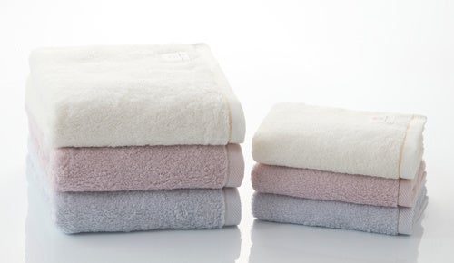 特別に誂えた至福の糸を使用。ほっとするような肌ざわりと、こころを込めて作られた高い品質。今回のリニューアルでは、タオルのパイル糸をロングパイルにすることにより、より柔らかく、吸水性に優れた上質なタオルを実現しました。一般的な綿よりも繊維長が長くしなやかで光沢がある原綿を用い、優しく撚りあげる甘撚り製法により、肌にふれるパイルを柔らかく仕上げています。ホワイト・ピンク・ブルーの落ち着きのある優しいカラーで、タオルのヘム部分にはさりげないラメ糸が光ります。