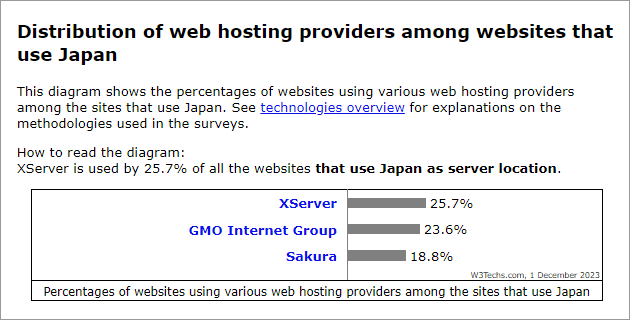 W3Techsとは、オーストリアに拠点をおくコンサルティング会社Q-Success社を母体とした、インターネットやWebテクノロジー専門の第三者調査機関です。同調査機関が提供するホスティングシェアの調査において、エックスサーバーが国内トップシェア率25.7%を獲得しました。この結果から、日本ではWebサイトの約4分の1が『エックスサーバー』を利用していることがわかります。