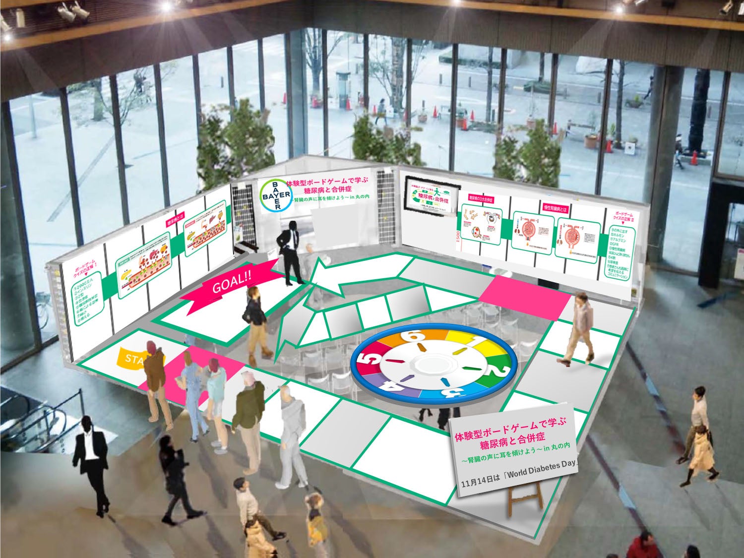 大阪、2024年10月24日 ― バイエル薬品株式会社(本社:大阪市、代表取締役社長:イン・チェン、以下「バイエル薬品」)は、糖尿病(ダイアベティス)と合併症に関する啓発活動の一環として、「体験型ボードゲームで学ぶ糖尿病と合併症 ~腎臓の声に耳を傾けよう~ in 丸の内」を11月14日の「World Diabetes Day(旧 世界糖尿病デー)」にちなみ2024年11月7日(木)、8日(金)の両日、丸ビル1階 マルキューブ(東京都千代田区)にて開催します。本イベントでは、サイコロを振ったりルーレットを回したりして来場者自身がマス目を歩くことができる特大サイズの体験型ボードゲームが、会場の床一面に出現。ゲームを進めながら糖尿病と合併症について楽しみながら学ぶことができます。