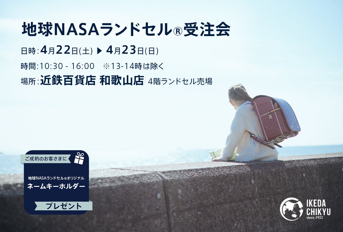 ランドセルの企画・販売を行う池田地球株式会社(本店:東京都港区:代表取締役 村尾光一)は、近鉄百貨店和歌山店の4階ランドセル売場にて、4/22(土)~4/23(日) の2日間限定で「地球NASAランドセル®受注会」を開催いたします。