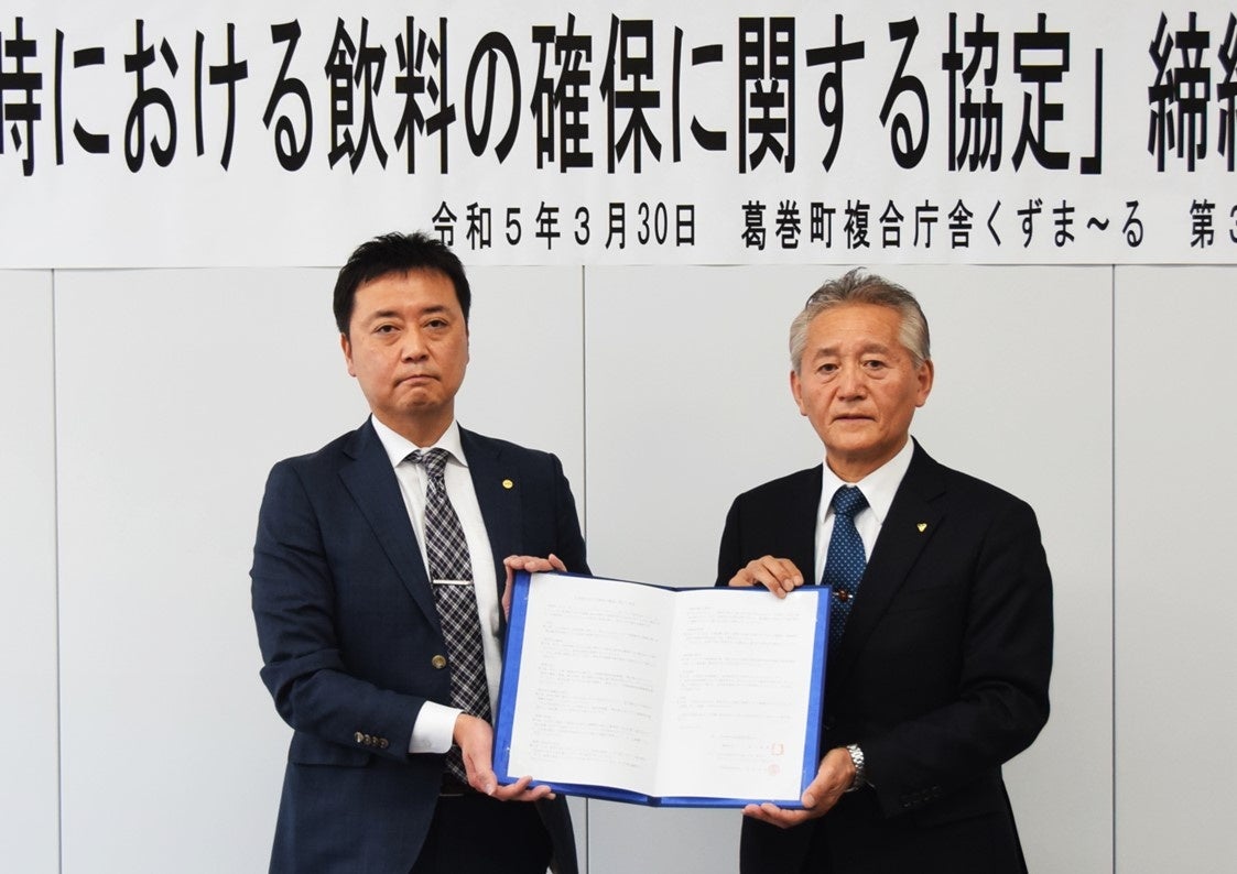 「本町ではいつ発生するかわからない大災害から住民の生命を守るため、防災体制の充実・強化に努めておりますが、町ひとつの力だけでは災害の発生時に対応しきれなくなる恐れも感じているところでございます。こうした中で本日の協定締結は大変ありがたく、災害時での迅速な飲料の確保が可能となることは、町民の安心感につながるものと心強く感じております。」
