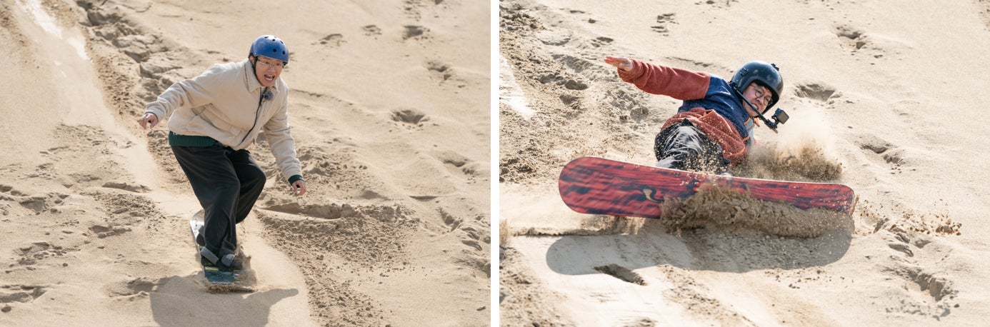 さらに、作中で登場する砂漠に住む巨大生物サンドワームの背中に乗ってポールが砂漠を駆けるシーンさながらに、ミキの2人が鳥取砂丘でサンドボードに挑戦!迫力のある走りを披露しました。