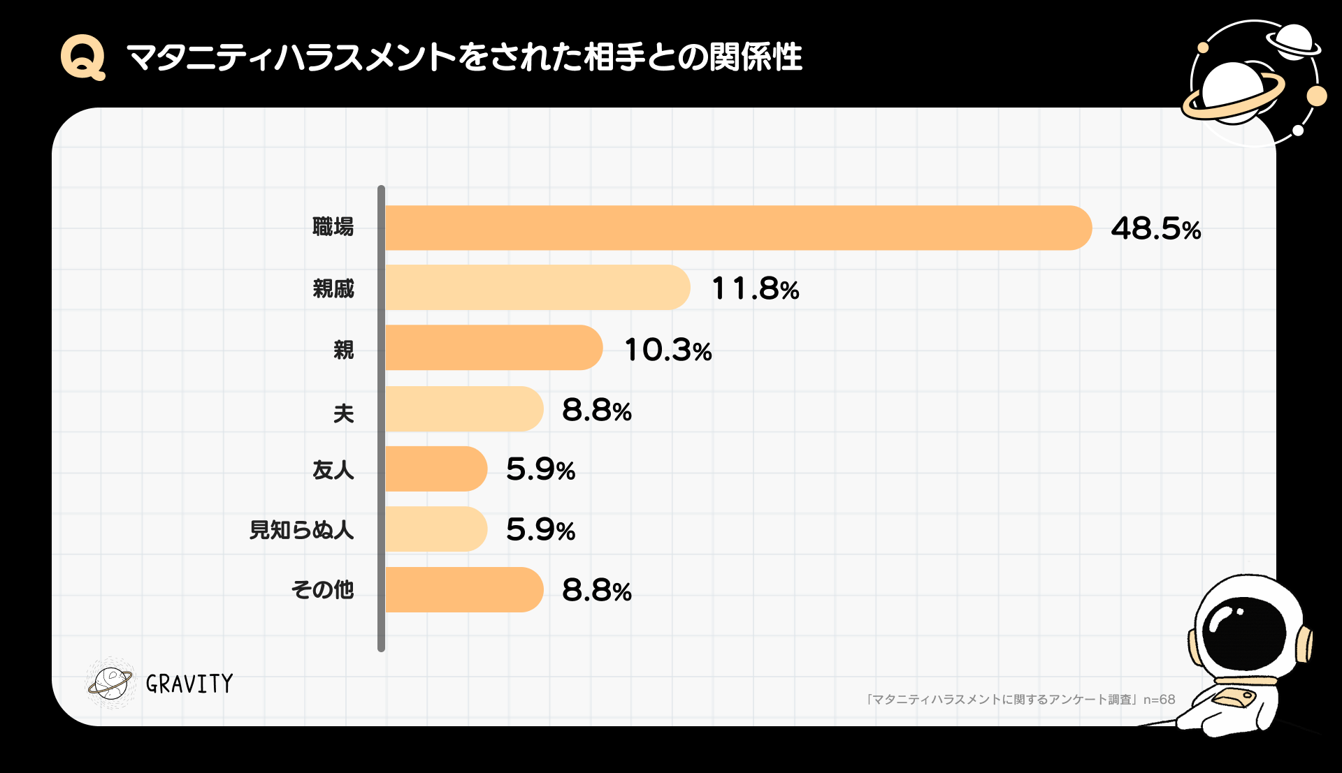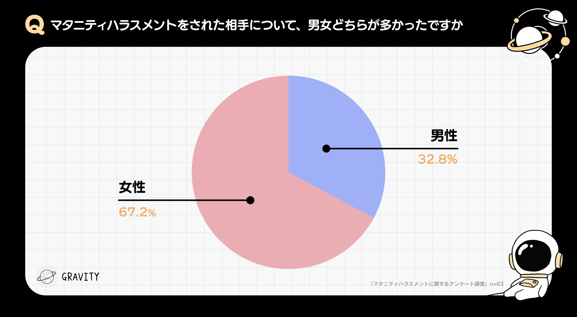 マタニティハラスメントをされた相手は「女性」からが67.2%、関係性は「職場」48.5%。