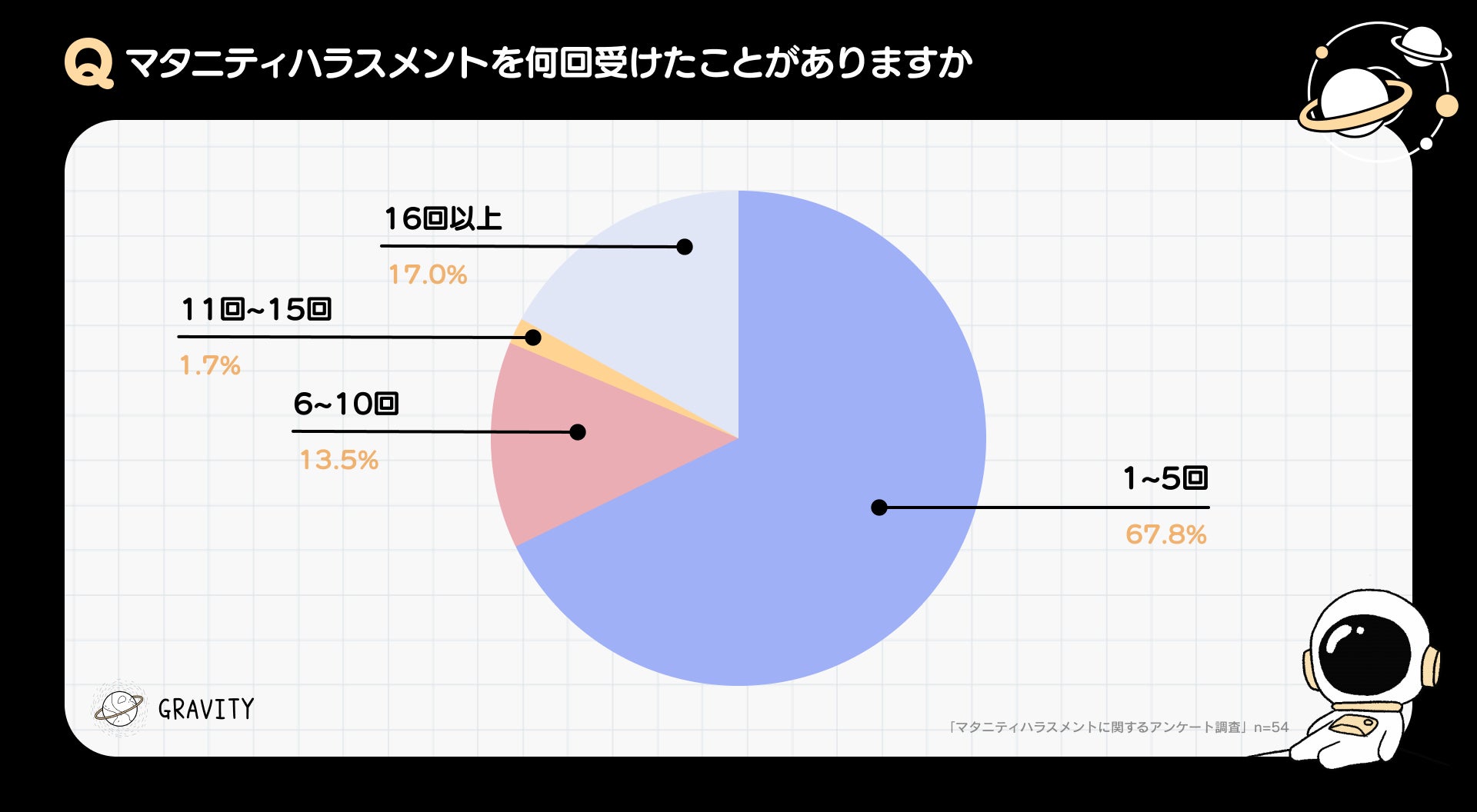 これまでにマタニティハラスメントを受けたことがあると回答した人が16.4%で、そのうち17.0%の人が16回以上受けたことがあると回答しました。