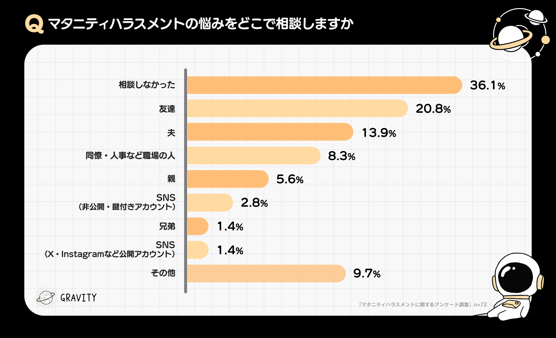 マタニティハラスメントの悩みは「誰にも相談しない」が36.1%、職場の人への相談はわずか8.3%。